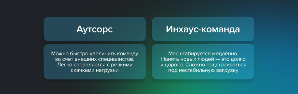 Аутсорс умеет масштабироваться почти мгновенно: пик проекта — и подрядчик подключает нужных людей, открывая доступ к глобальному пулу экспертов. Такая гибкость ценна там, где спрос скачет как график на старте ракеты, а загрузка проекта нестабильна.
