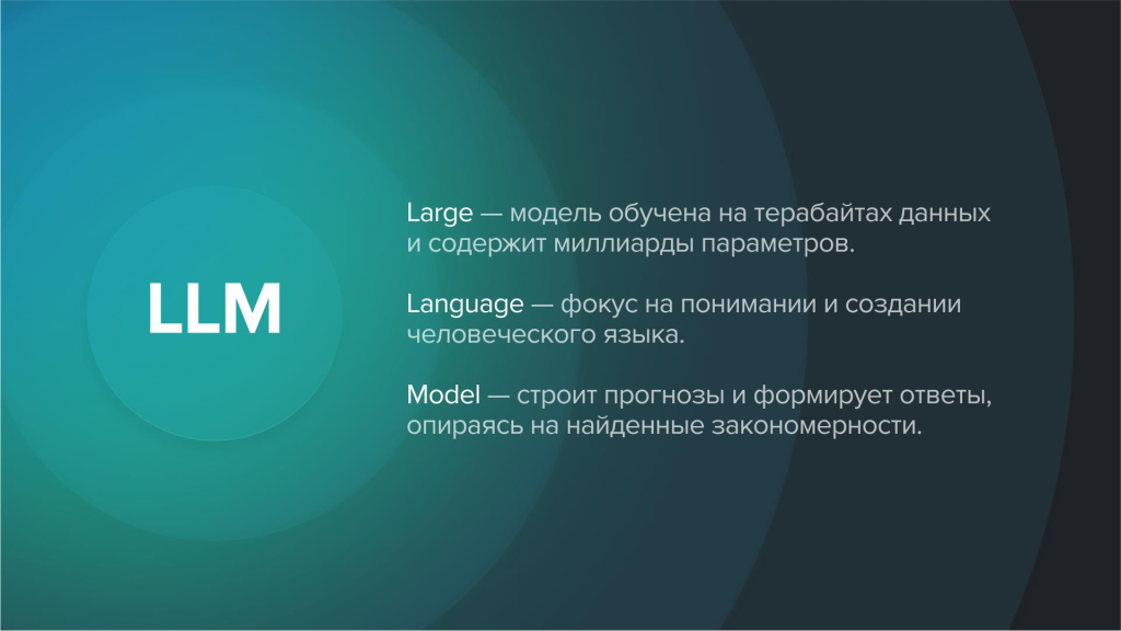 Большая языковая модель — это нейросеть, которая учится говорить на человеческом языке, переваривая терабайты текстов: от научных статей до форумных переписок. Она понимает контекст, строит связи и предсказывает, какое слово должно быть следующим. LLM стоит на пересечении трех технологий: