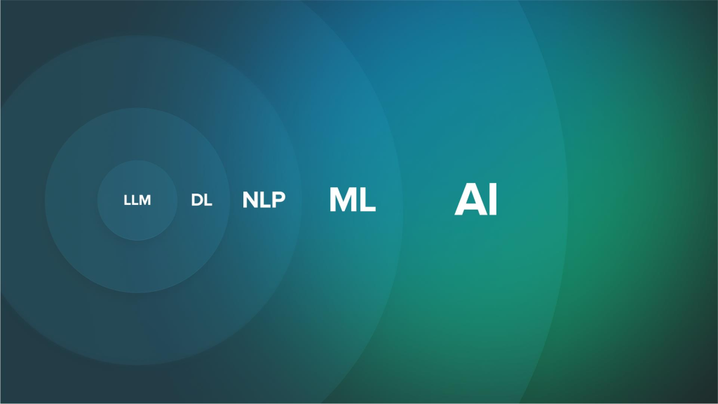 Искусственный интеллект (AI) — это общее название для технологий, которые пытаются воспроизвести человеческое мышление. Внутри него находятся машинное обучение (ML), еще глубже — обработка естественного языка (NLP) и глубокое обучение (DL). Внутри DL развивается генеративный ИИ, а уже в нем — большие языковые модели (LLM).