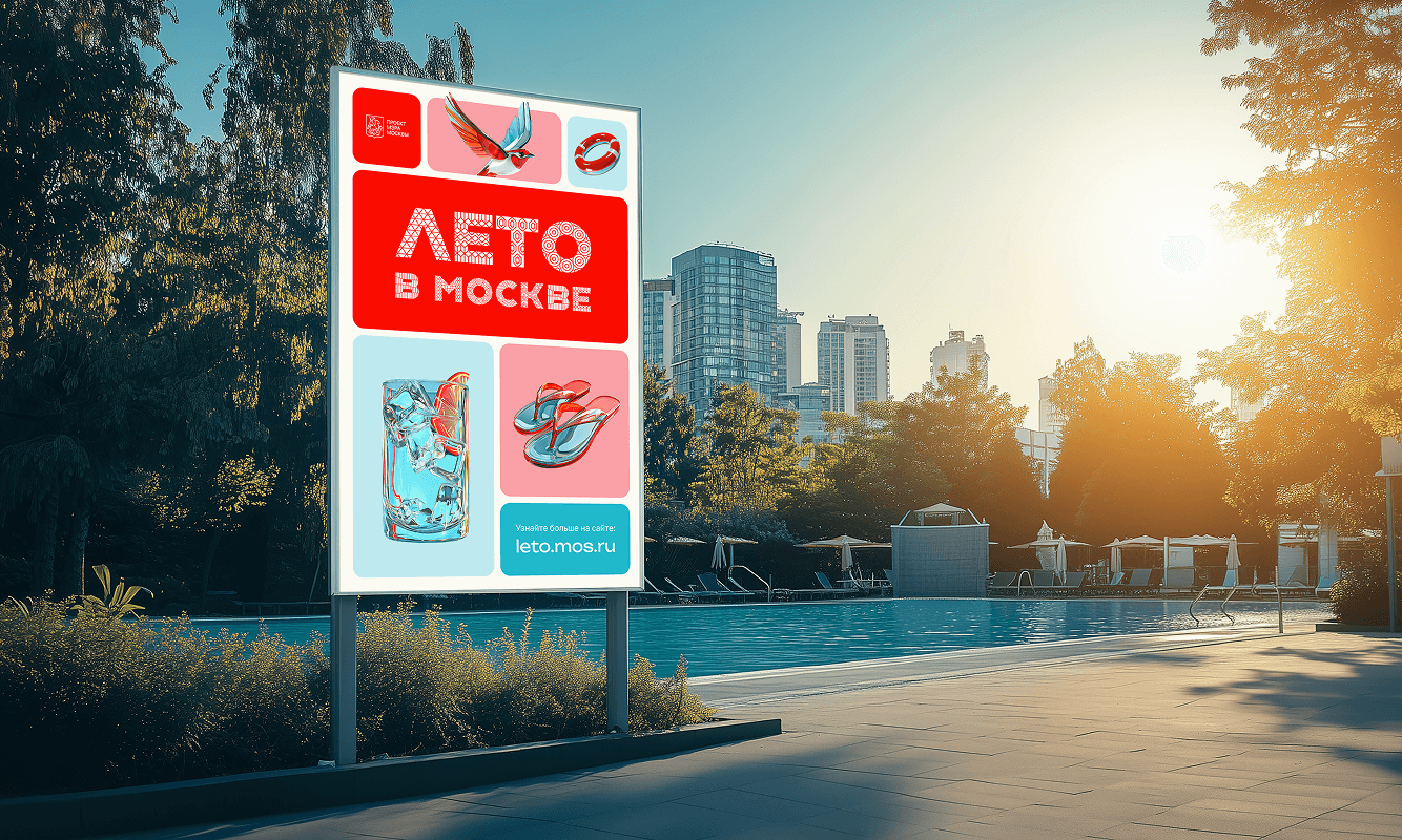 Летний отдых в Москве включает в себя массу водных активностей: сапборды, речные трамвайчики, катамараны, парусный спорт и, конечно же, отдых на шезлонге у бассейна. Всё это мы отразили в фирменном стиле с добавлением водных тонов, глянцевых и стеклянных материалов