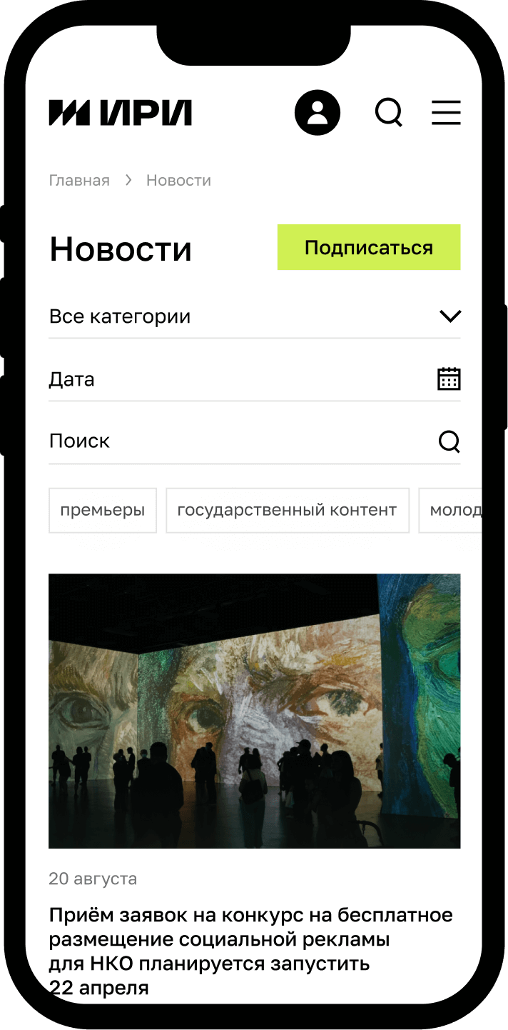 На странице можно подписаться на новости компании, а также воспользоваться поисковой строкой или удобной системой фильтров. Отфильтровать новости можно как по категориям (например, анонсы, исследования, события), так и по дате с выбором интервала. Дополнительно настроена фильтрация по хештегам (например, молодежный контент, видеоконтент, документы).