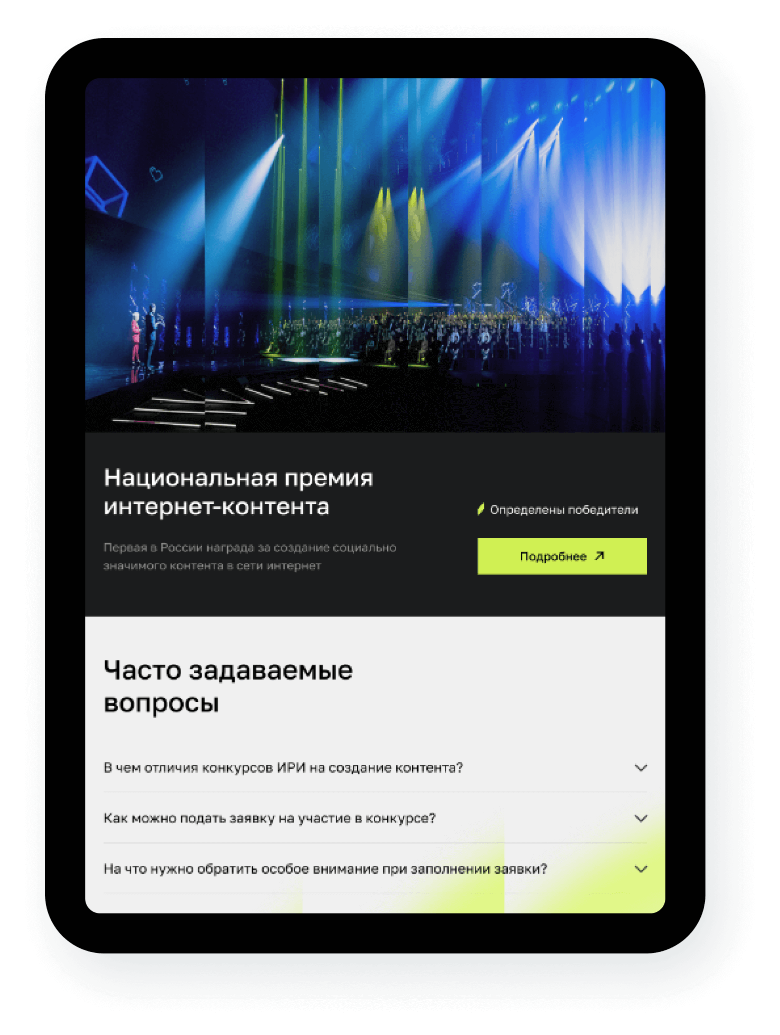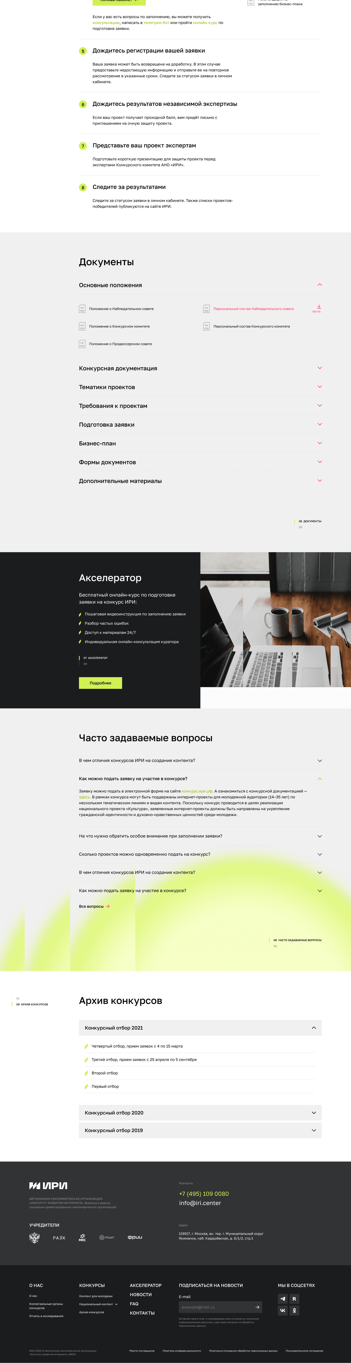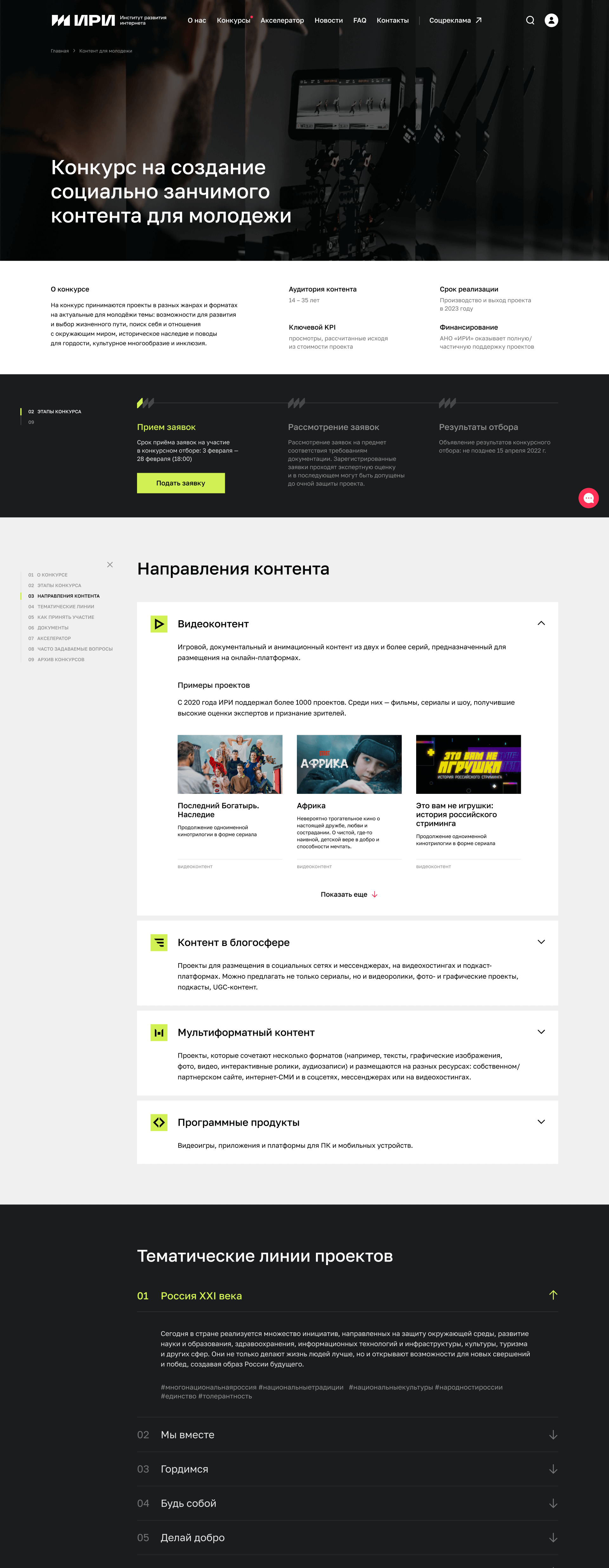 Страница конкурса содержит подробную информацию о нем, его аудитории, этапах с дедлайнами. Активный этап выделяется цветом на таймлайне. ИРИ — организатор нескольких конкурсов, у каждого из которых отдельная страница на сайте. Заложена возможность создать новые страницы для конкурсов.