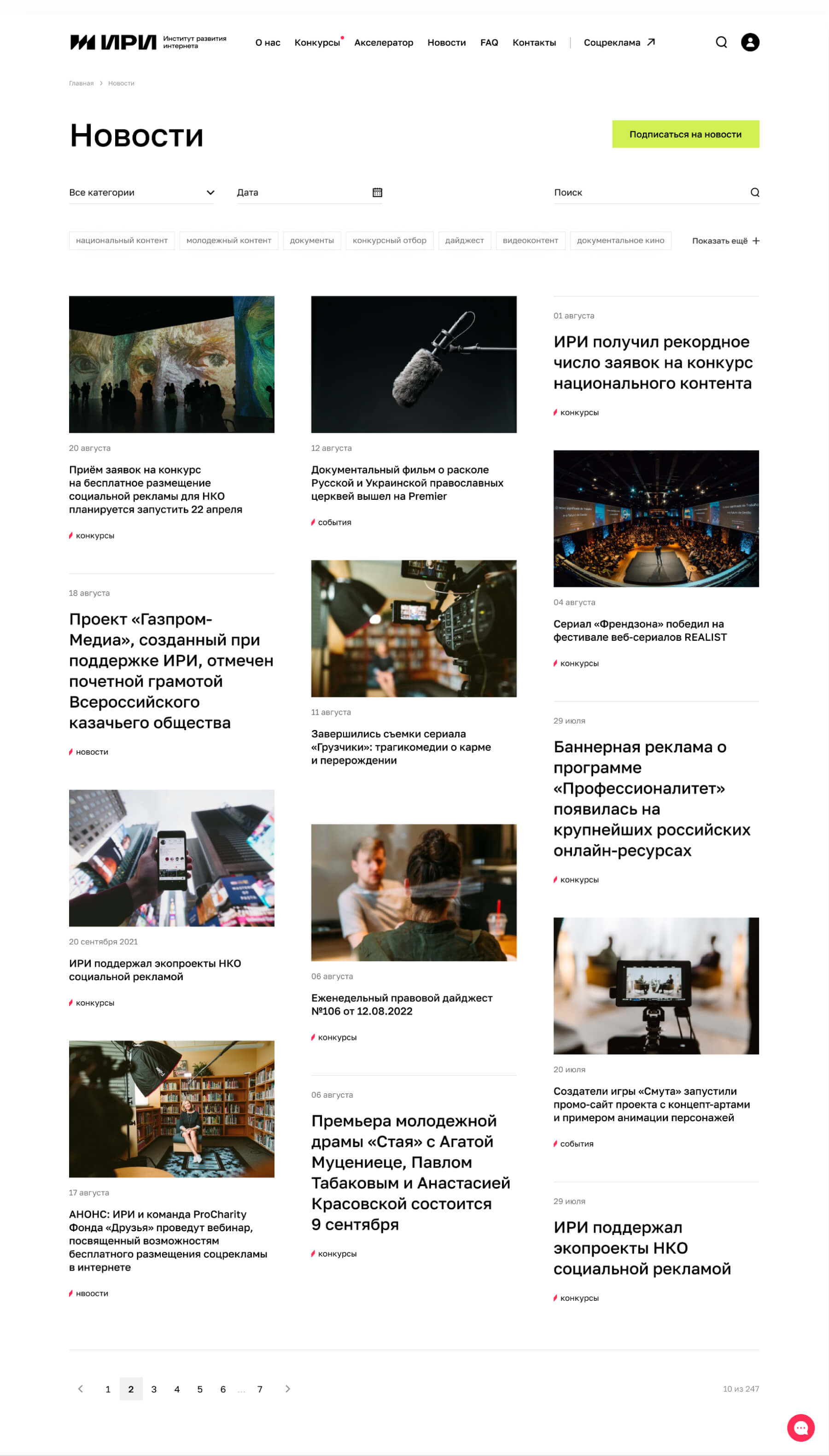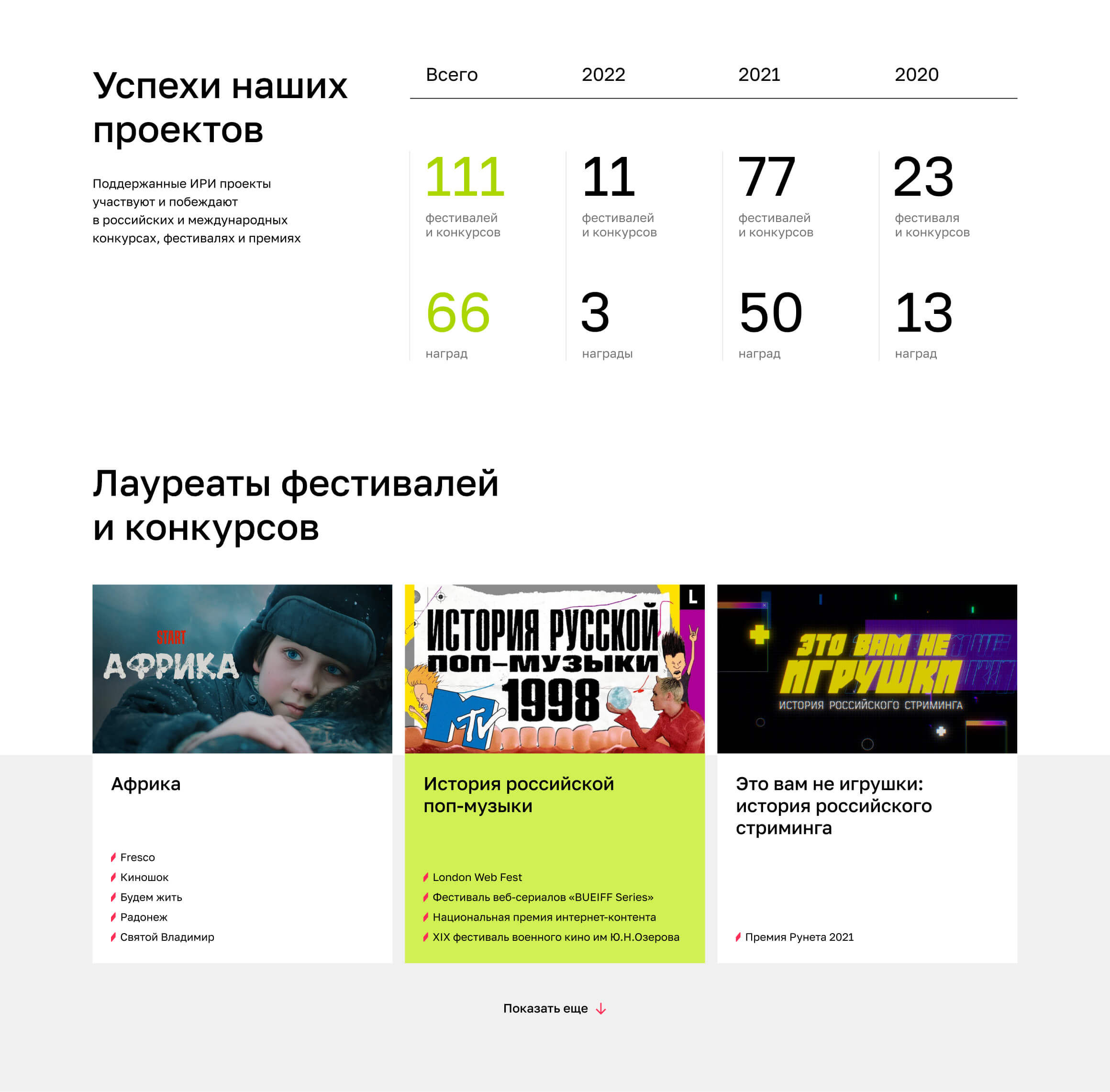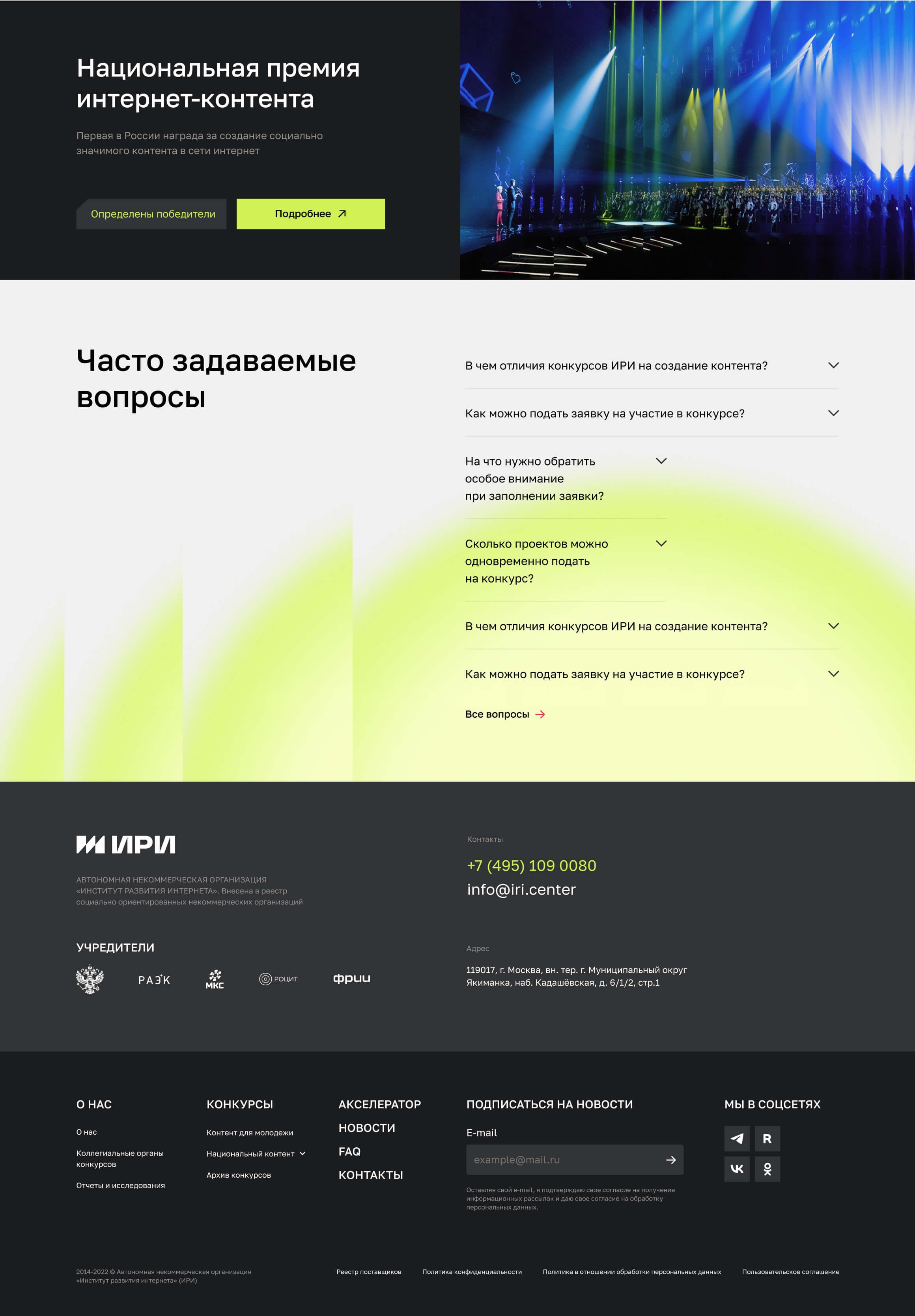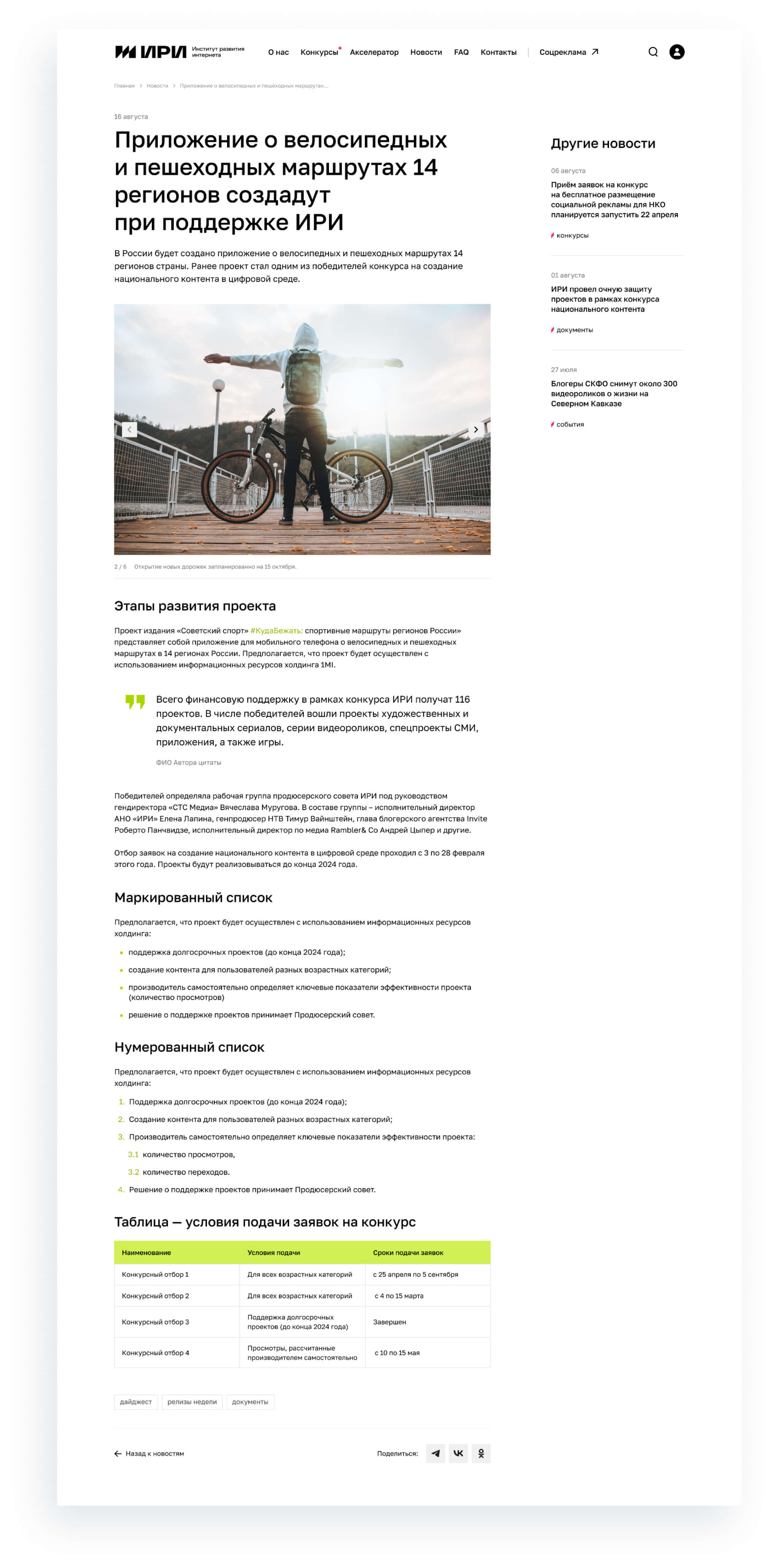 Страница конкурса содержит подробную информацию о нем, его аудитории, этапах с дедлайнами. Активный этап выделяется цветом на таймлайне. ИРИ — организатор нескольких конкурсов, у каждого из которых отдельная страница на сайте. Заложена возможность создать новые страницы для конкурсов.