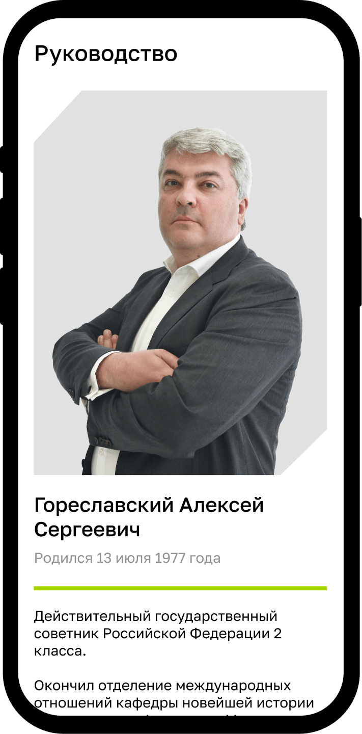 Страница «О нас» отображает основную информацию о деятельности организации. Блок «Руководство» представлен в виде таймлайна с описанием деятельности руководителя в порядке убывания года.