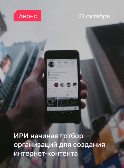 Институт развития интернета поддерживает креативные индустрии: с 2020 года на конкурсной основе распределяет государственные субсидии на создание и продвижение социально значимого интернет-контента. ИРИ — учредитель первой Национальной премии интернет-контента, которая призвана отмечать лучшие цифровые проекты социальной направленности