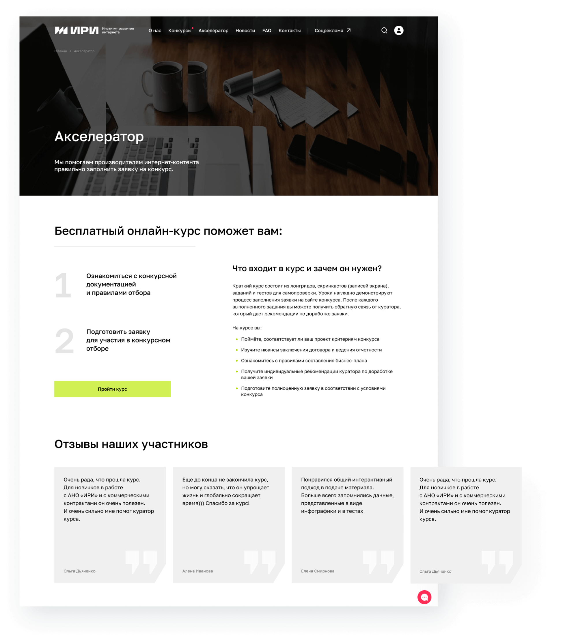 На странице акселератора пользователи могут ознакомиться с информацией о бесплатном онлайн-курсе, цель которого — помочь производителям интернет-контента правильно заполнить заявку на конкурс.