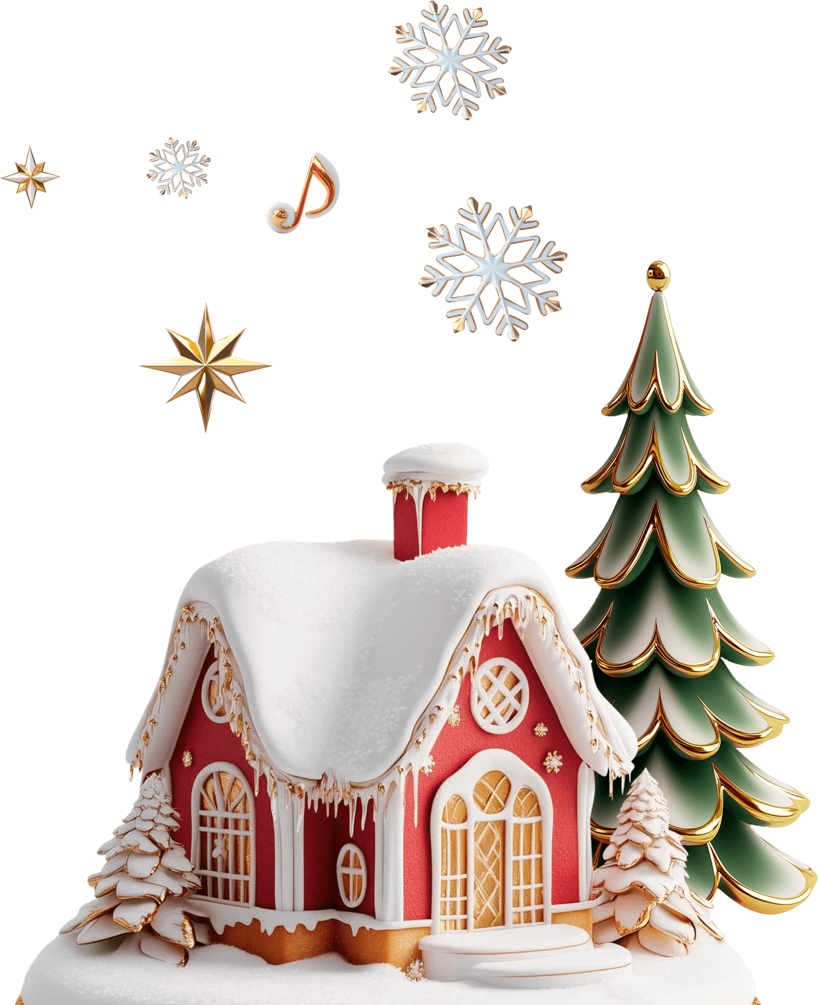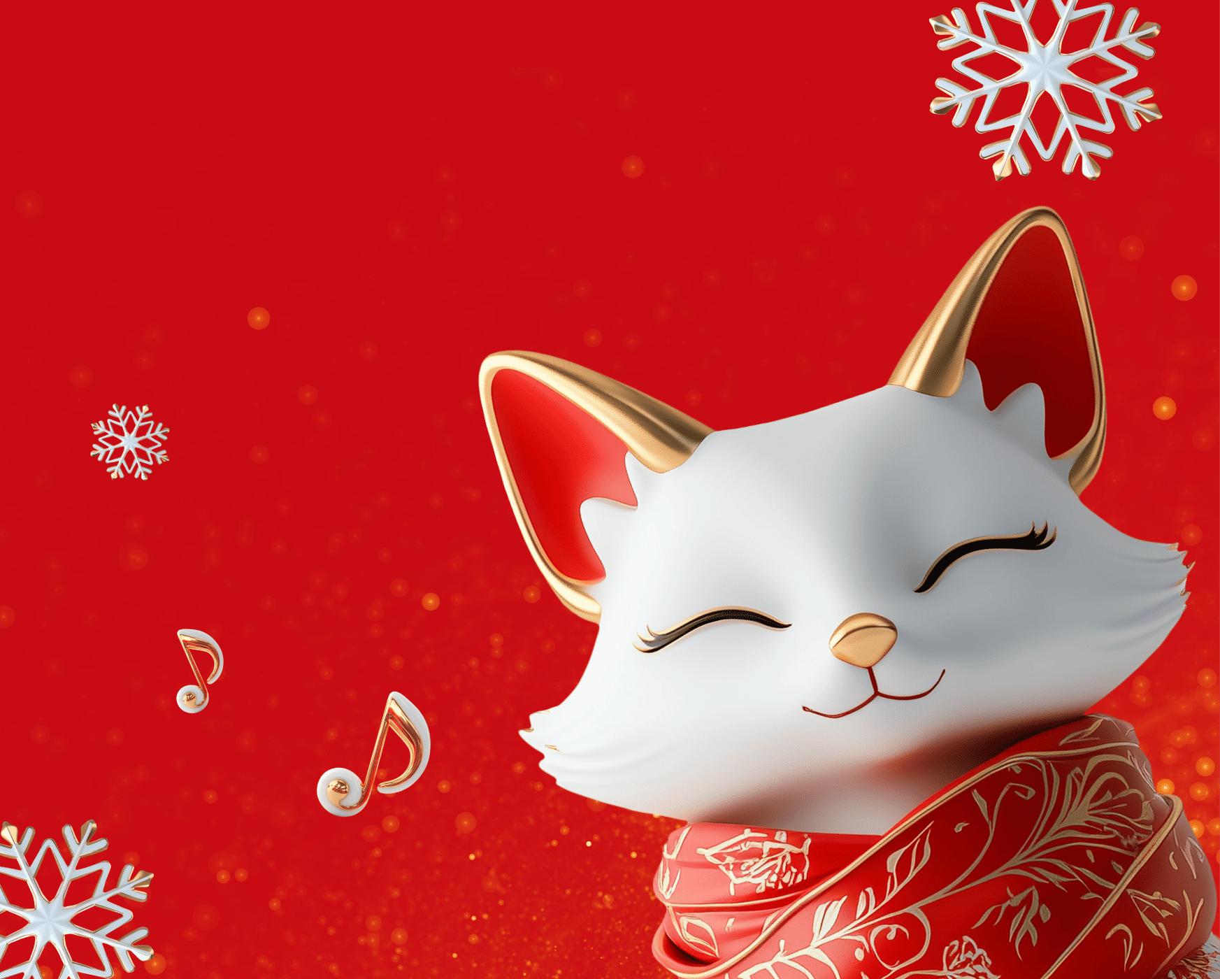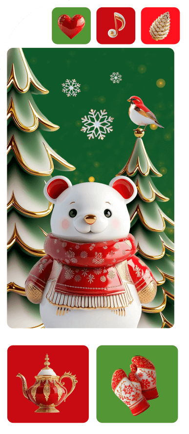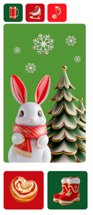 В оформлении мы уделили внимание даже таким деталям, как юбка ёлки. Здесь нам снова помогла бенто-сетка: она позволила гармонично встроить элементы кобрендинга и при этом сохранить единый визуальный стиль проекта.