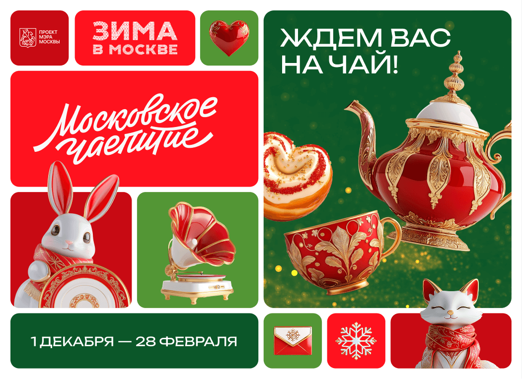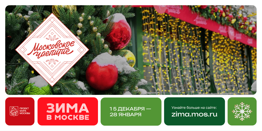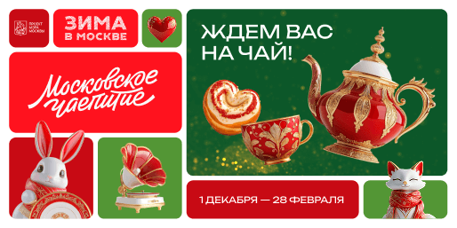 Мы разработали подробные правила кобрендинга и оформили их в гайдбук. Одним из примеров стала интеграция фестиваля «Московское чаепитие» в фирменный стиль «Зимы в Москве».