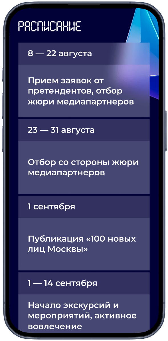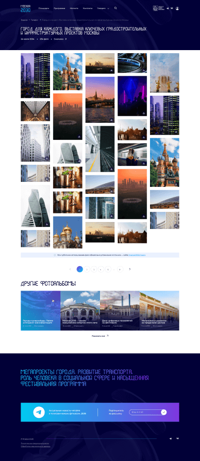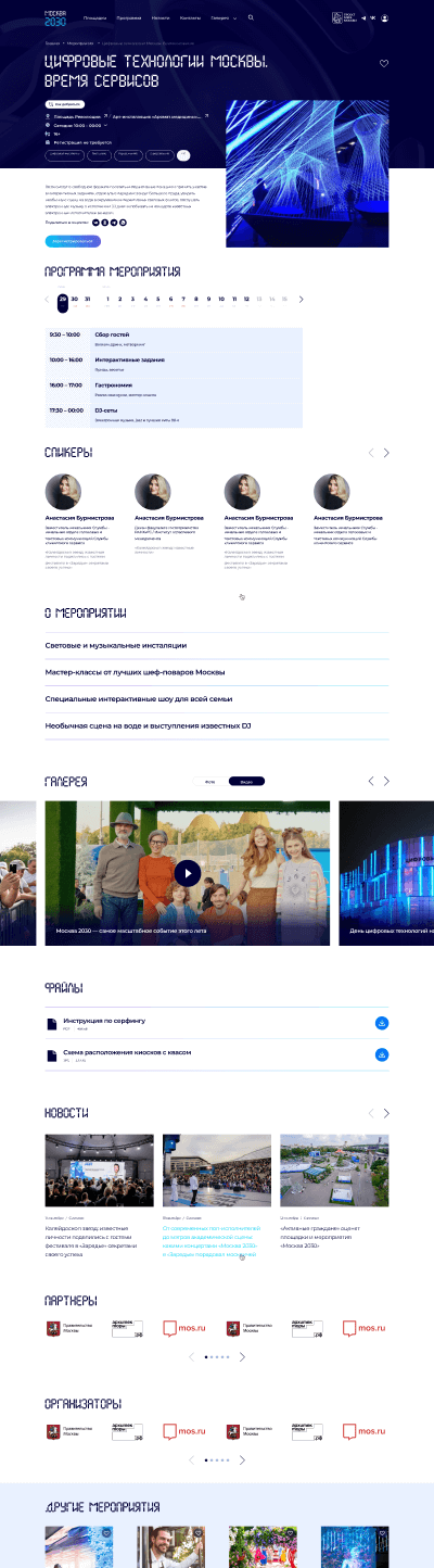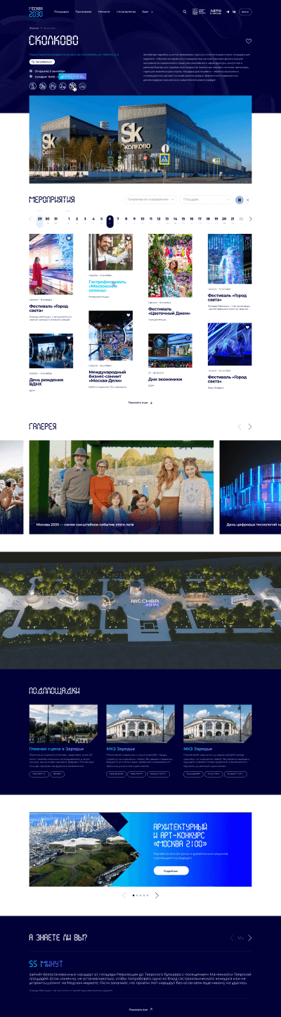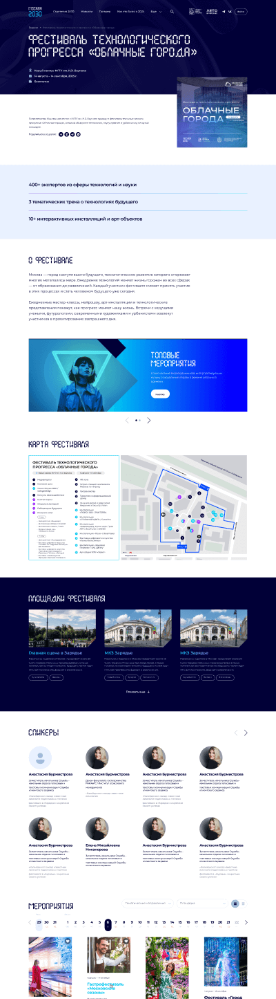 Основные страницы сайта получили уникальный и запоминающийся дизайн. Внутренние страницы созданы по универсальным шаблонам, которые наглядно показывают каждое мероприятие, площадку и спецпроект