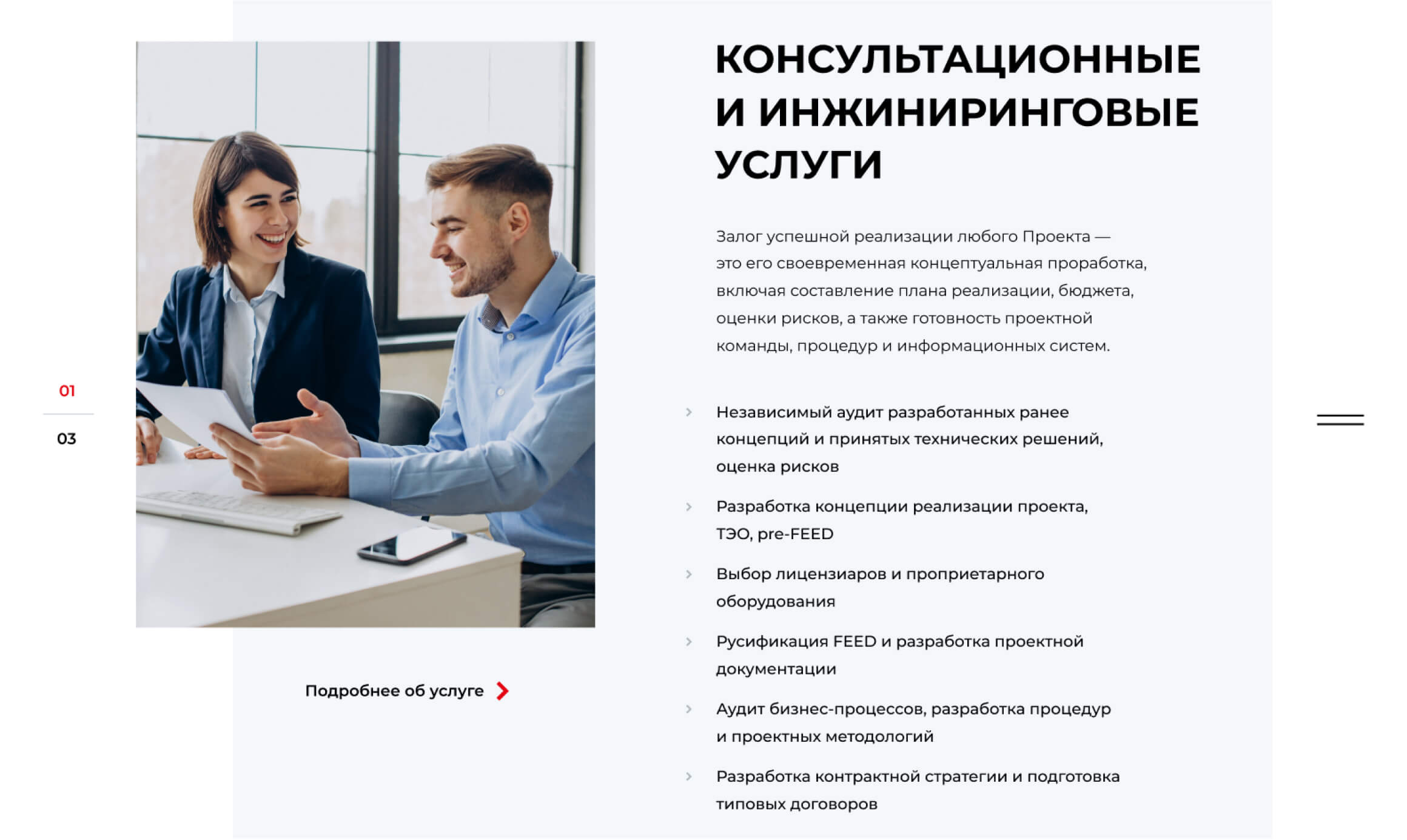Реализован отличный от всех страниц механизм скролла, основанный на фиксации положения картинки и ссылки, что позволяет работать с отличными друг от друга объемами текста каждой из услуг. Механизм фиксации также реализован на странице статьи пресс-центра.