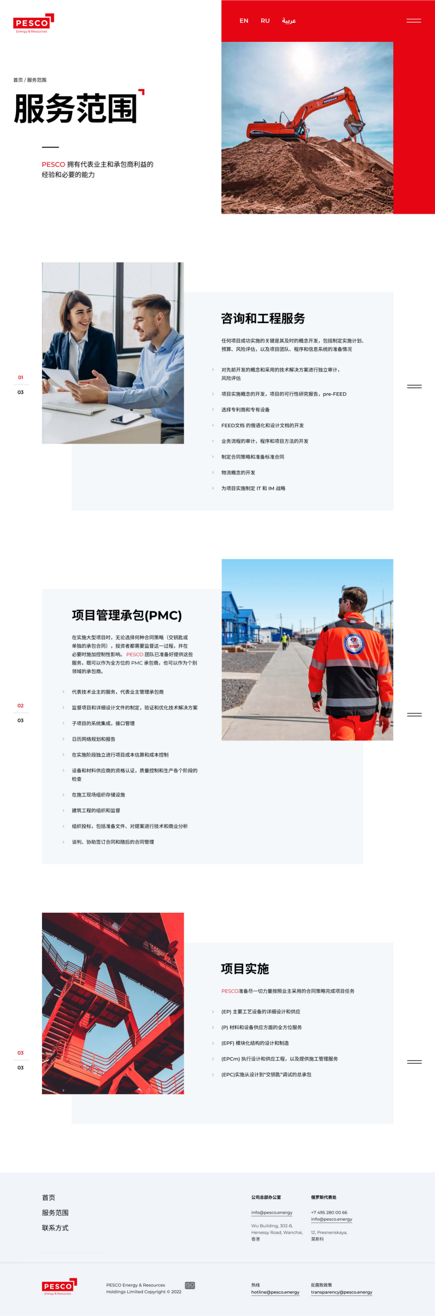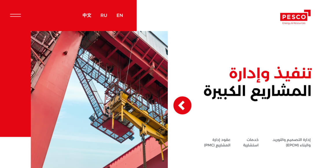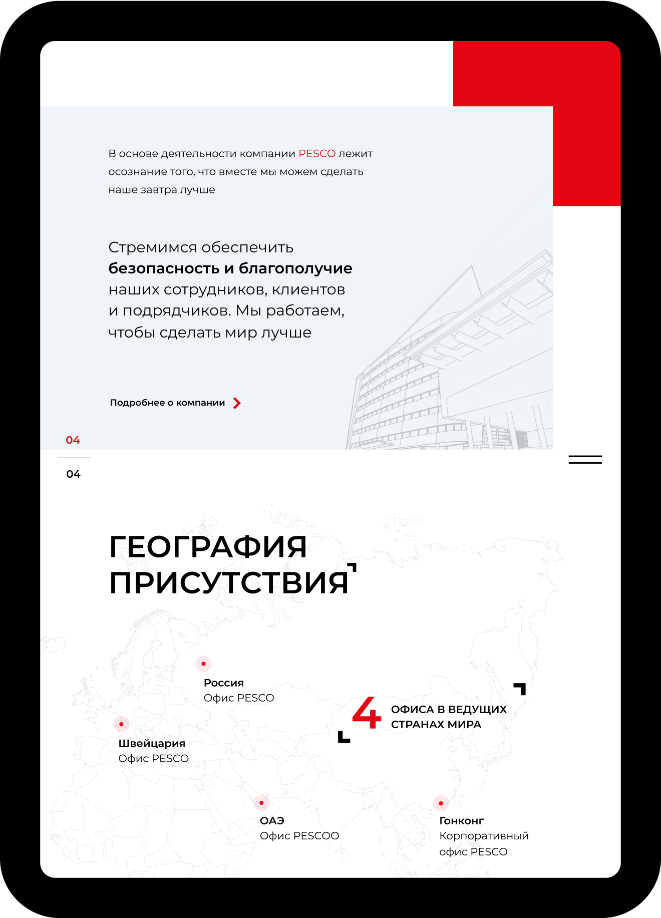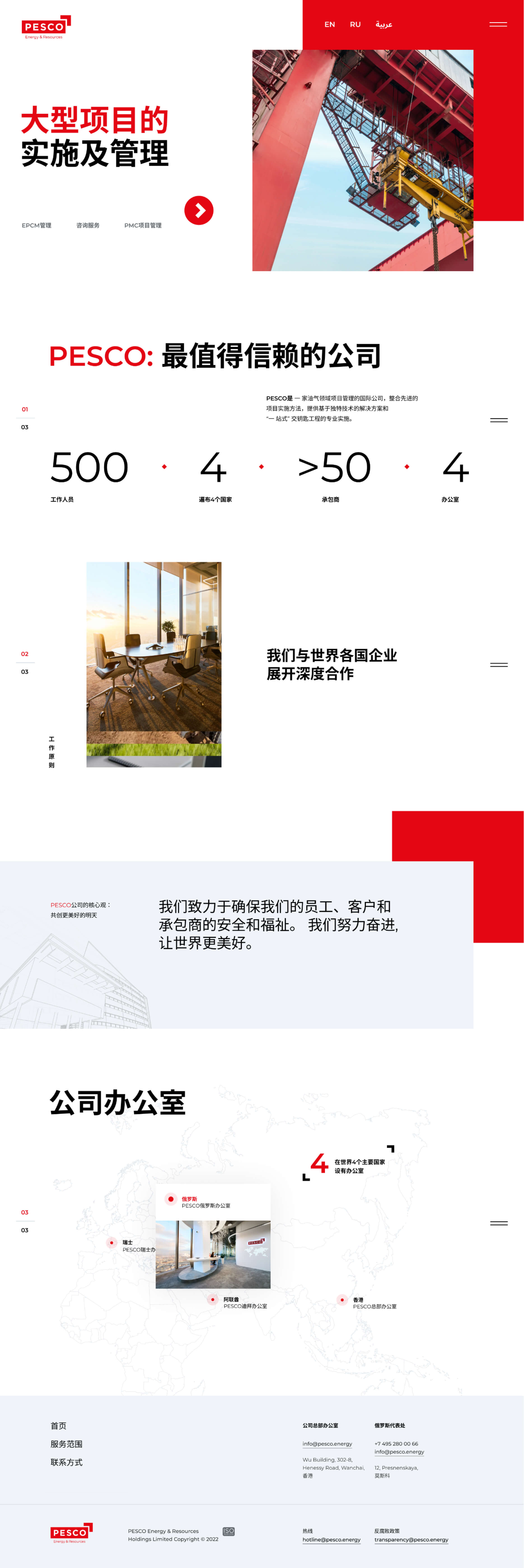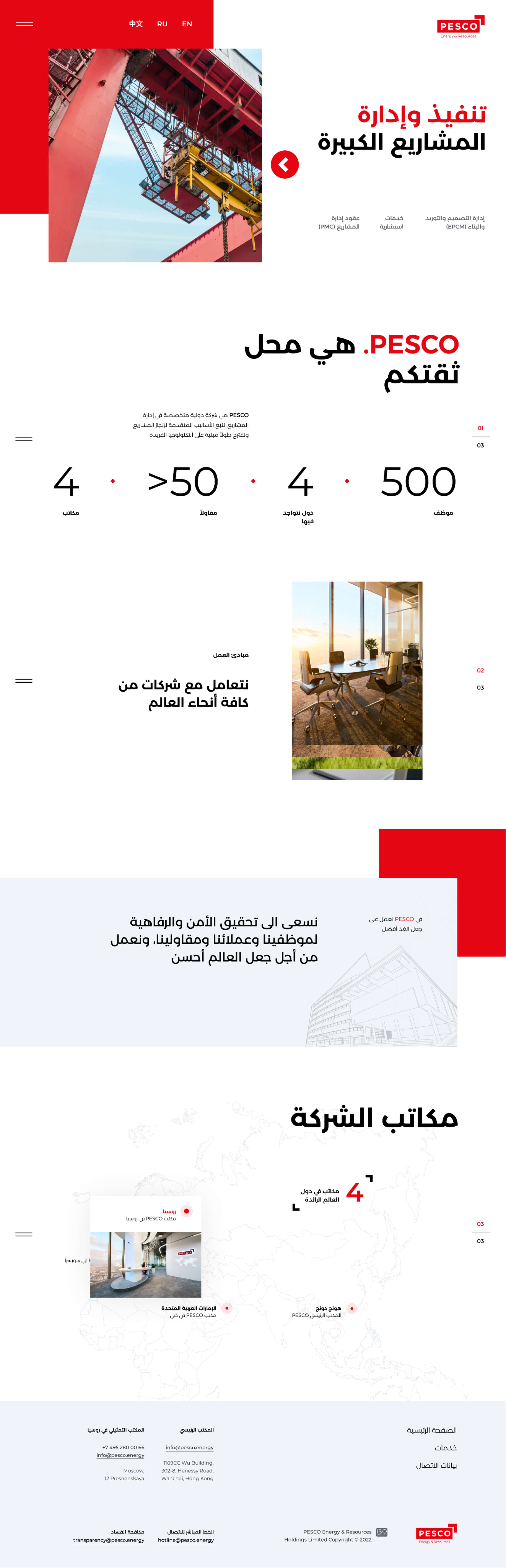 PESCO — международная компания с тремя зарубежными офисами (в Гонконге, ОАЭ и Швейцарии). Поэтому Notamedia разработала сайт в 4 языковых версиях: русской, английской, китайской и арабской. Реализован удобный механизм переключения на нужную версию в верхнем меню — по клику на иконку языка. В китайской версии сохранены расположение, логика и состав элементов аналогично русской и английской версии.