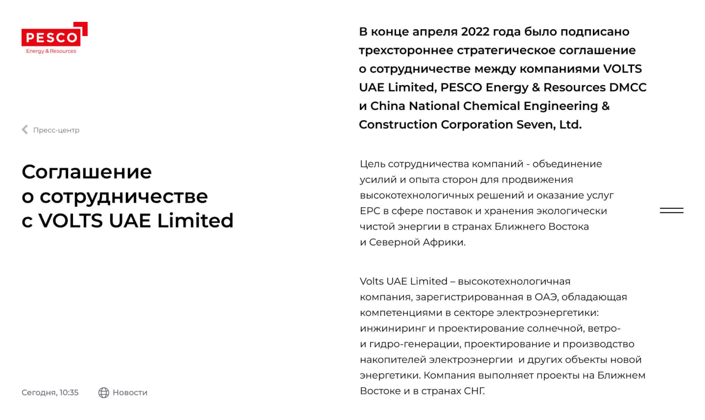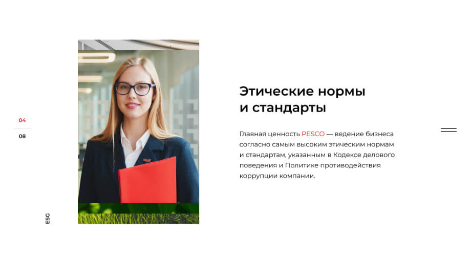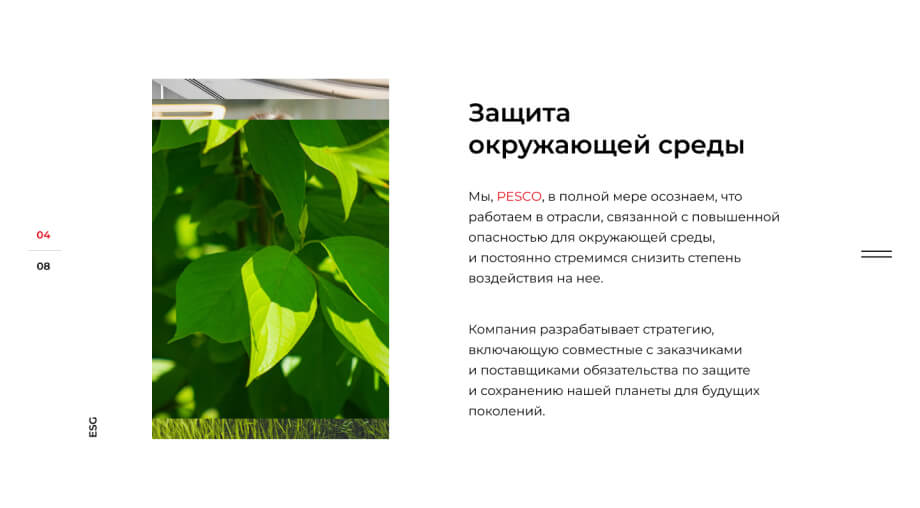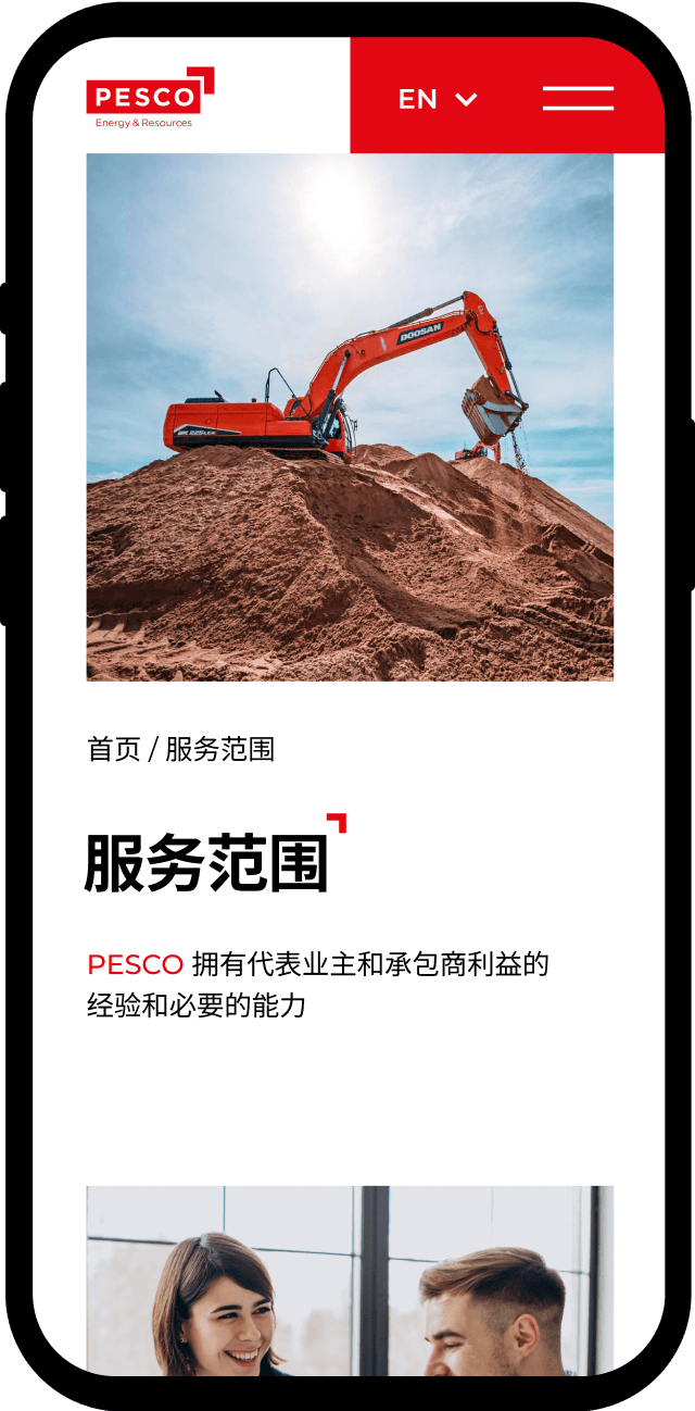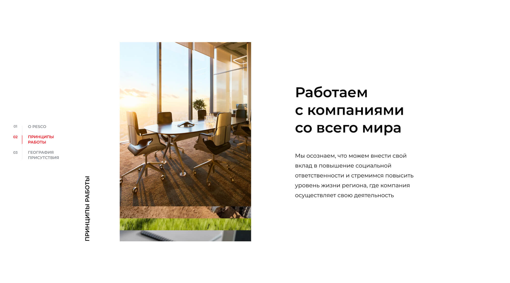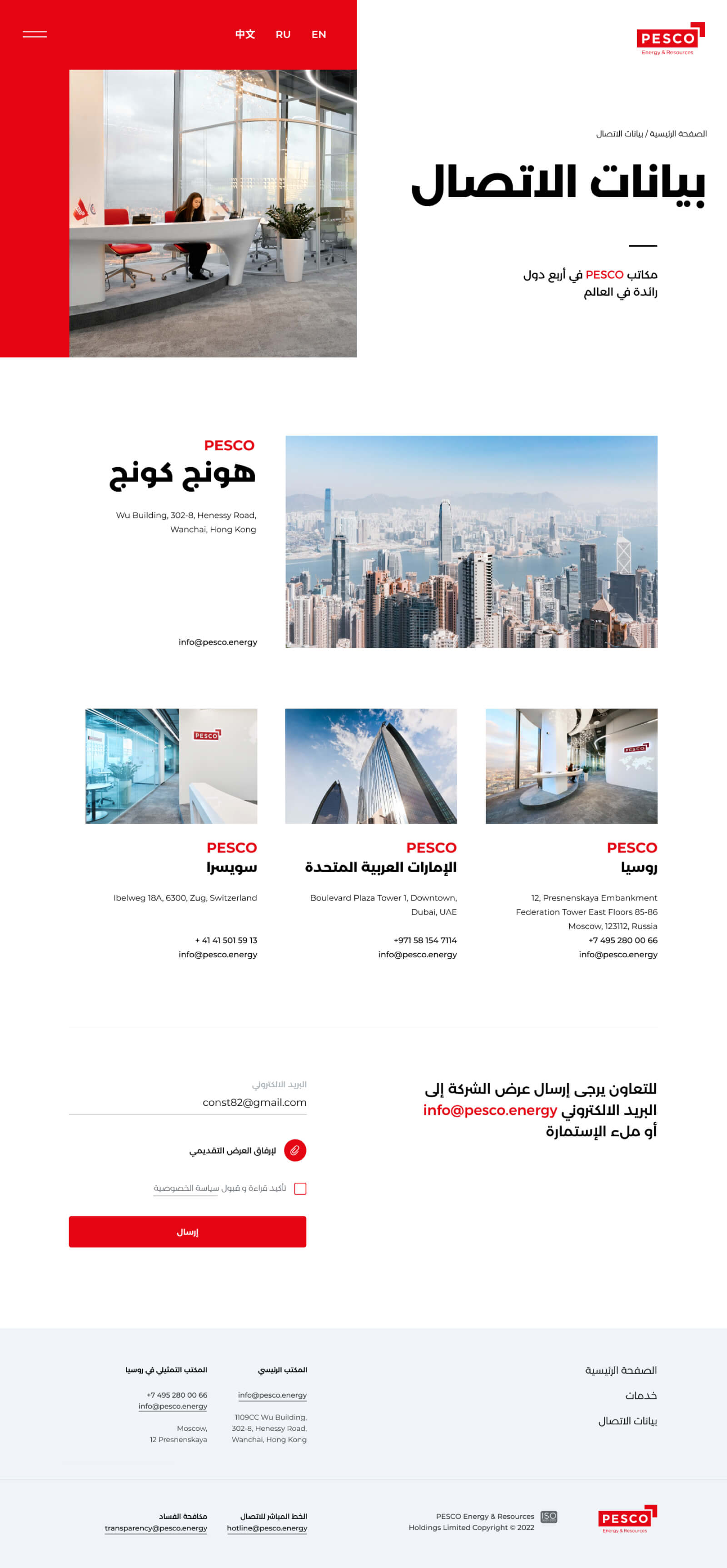 PESCO — международная компания с тремя зарубежными офисами (в Гонконге, ОАЭ и Швейцарии). Поэтому Notamedia разработала сайт в 4 языковых версиях: русской, английской, китайской и арабской. Реализован удобный механизм переключения на нужную версию в верхнем меню — по клику на иконку языка. В китайской версии сохранены расположение, логика и состав элементов аналогично русской и английской версии.
