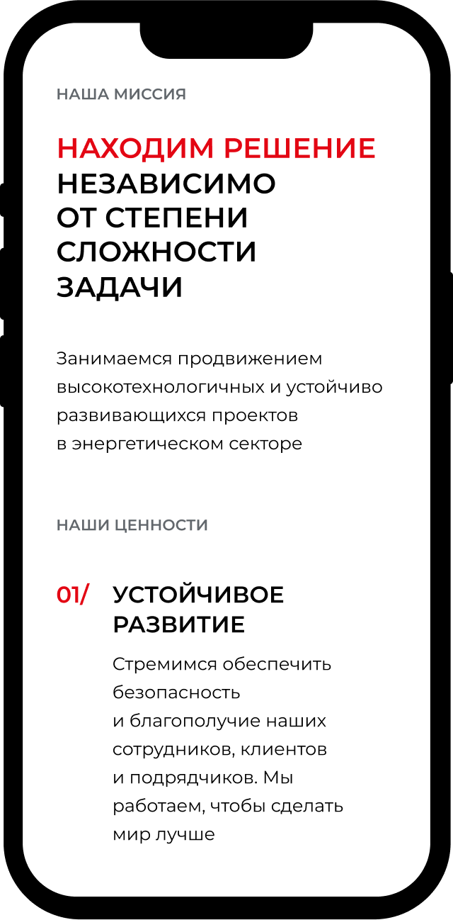 Для всех разделов сайта выбрана воздушная и минималистичная стилистика. Цветовая палитра ограничена, имеет акцент на красном цвете и опирается на брендбук. Создать сильные смысловые акценты и разнообразить подачу текста помогло выделение самых важных тезисов прописными буквами с более крупным кеглем.