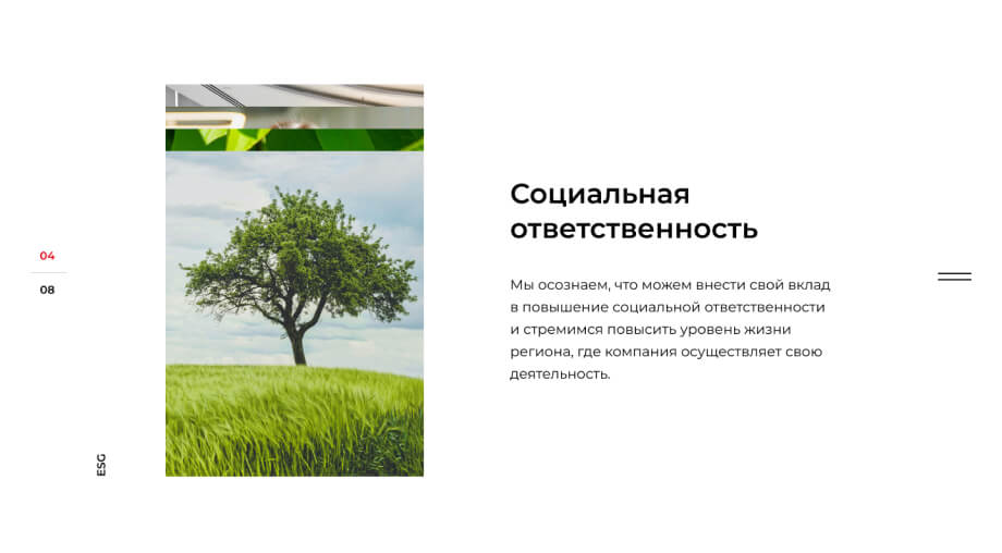 Каждая страница сайта имеет уникальную композицию, а верстка в процентах позволила пропорционально масштабировать страницы под любой размер экрана. Дизайн первого экрана отличается от главной страницы, но сохраняет отсылку к логотипу компании. Это позволяет выделить главную страницу среди прочих и решает проблему более короткой длины заголовков остальных страниц.