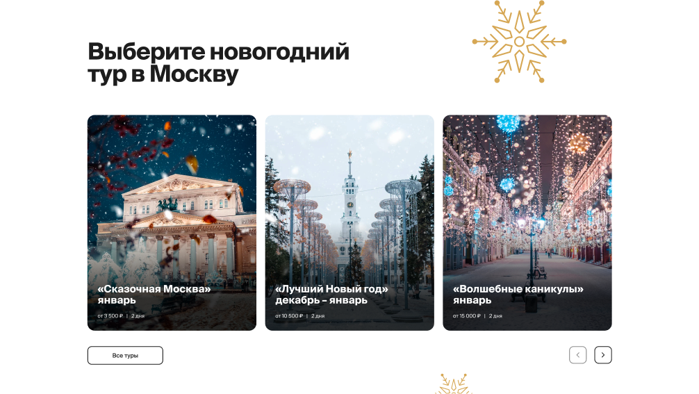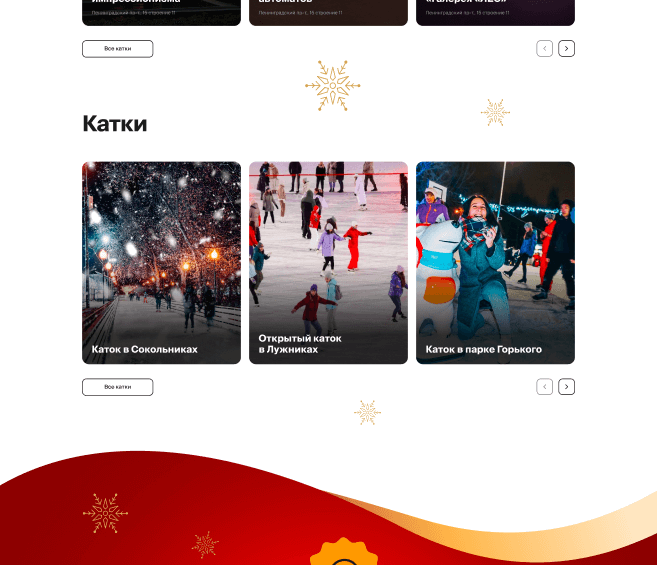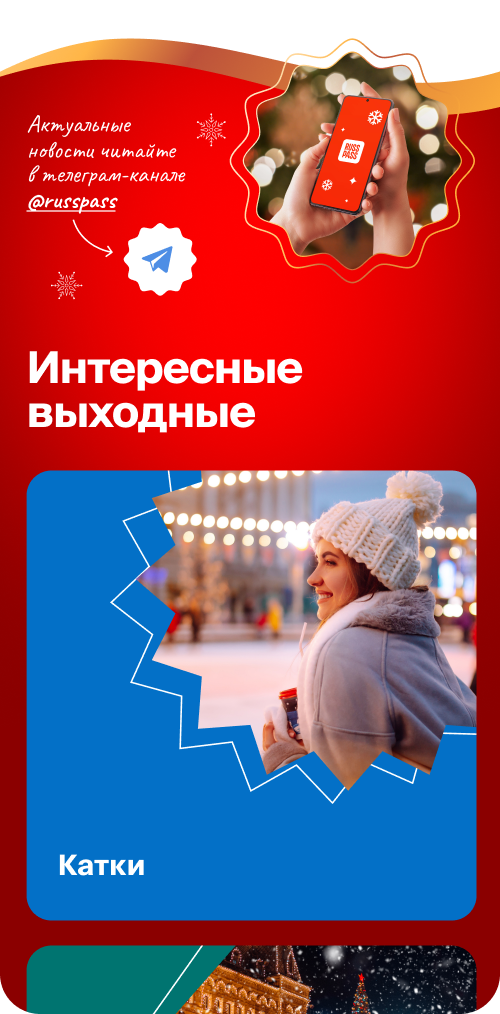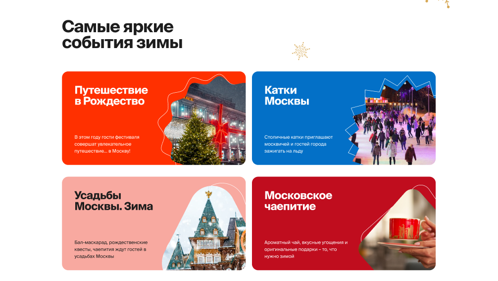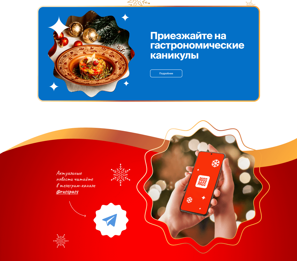 Сначала мы выпустили MVP-версию, которая информировала посетителей сайта о том, что в скором времени здесь появится полный список предложений по организации отдыха на новогодние праздники — анонсы событий. Также были представлены мероприятия, доступные на основном сайте RUSSPASS.