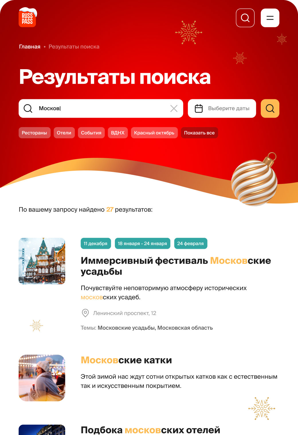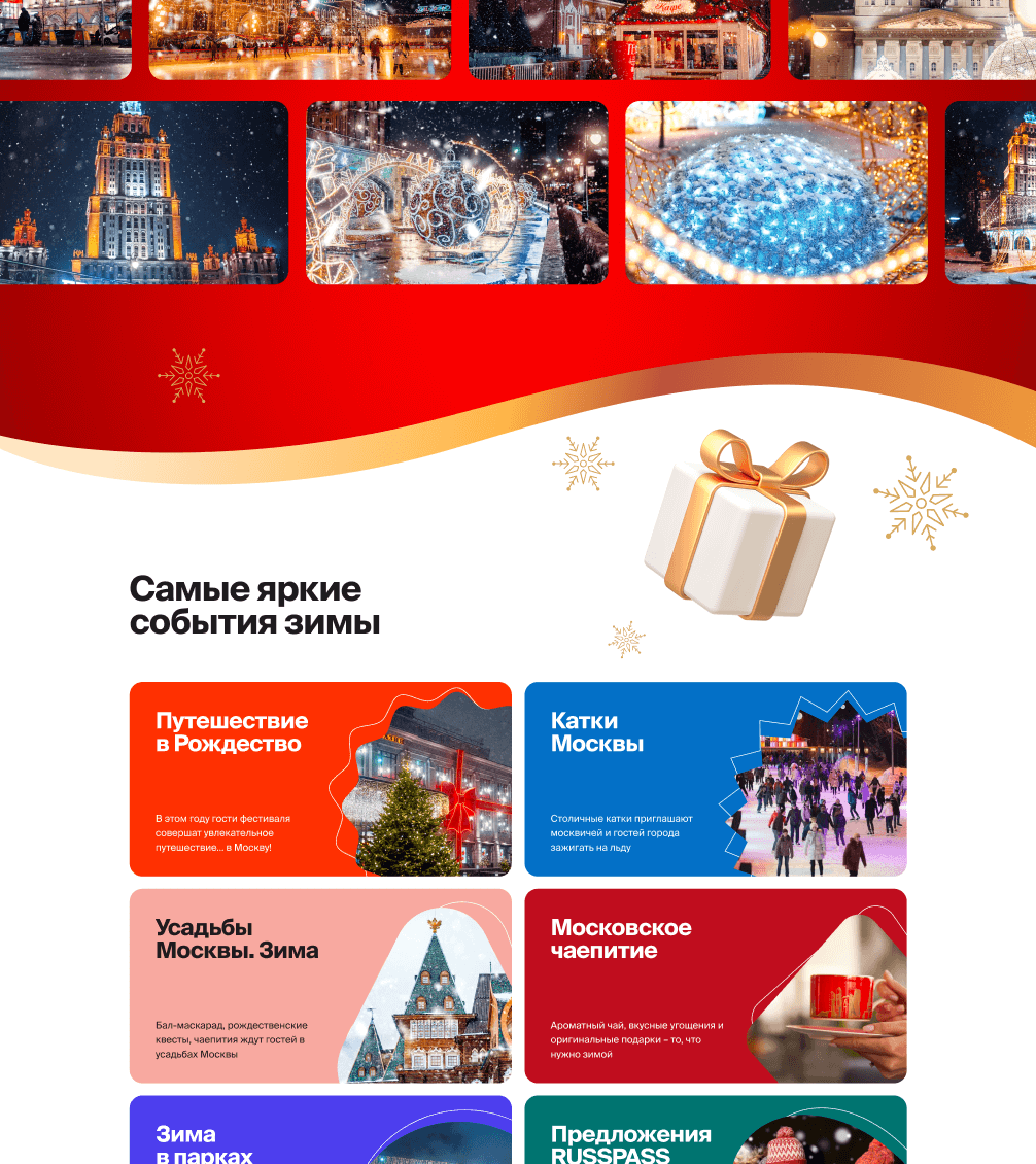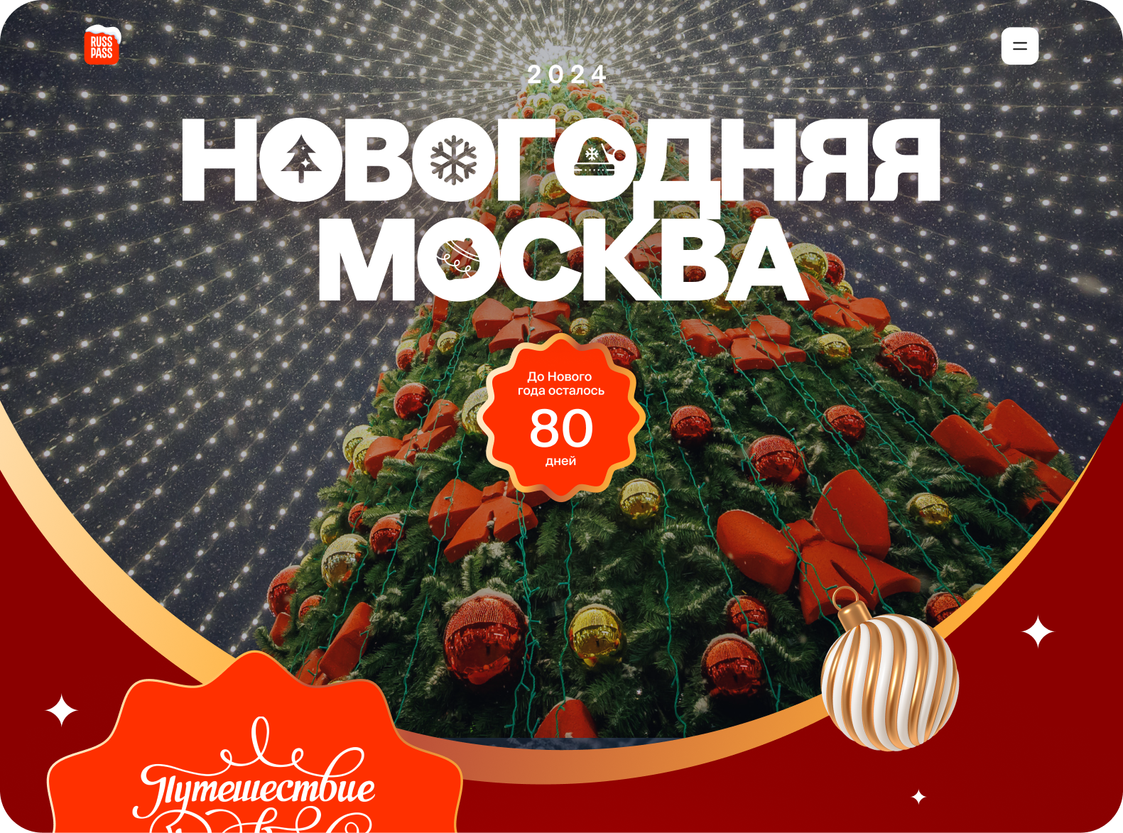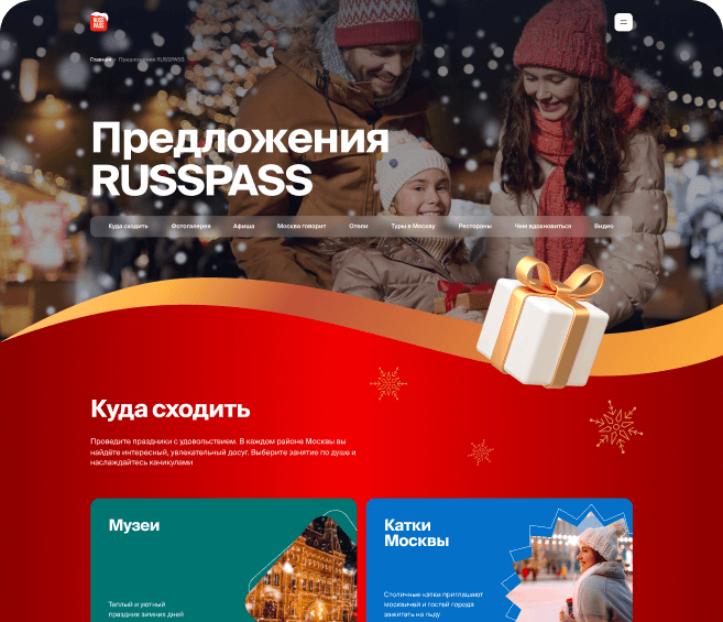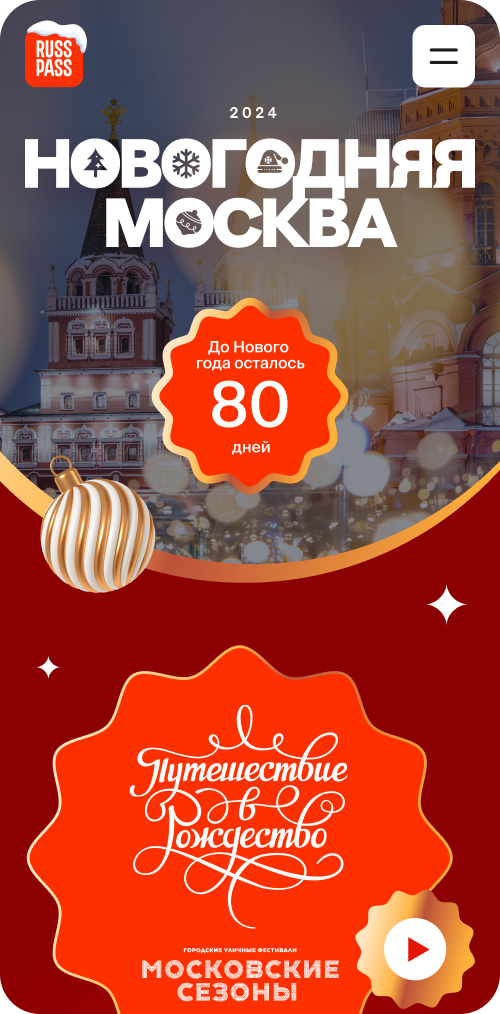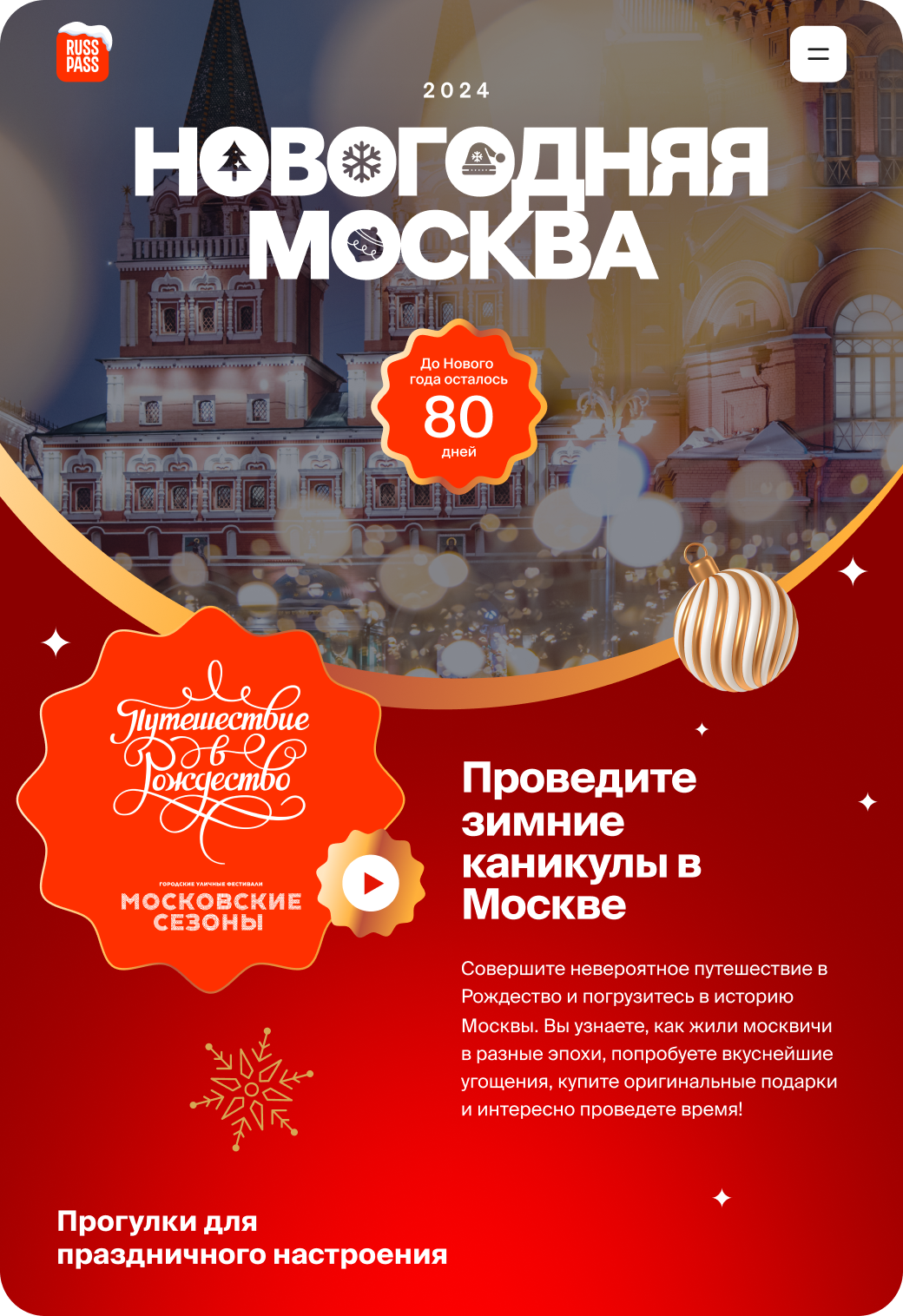 Целью разработки новогоднего сайта RUSSPASS было создание площадки, которая помогала бы москвичам и гостям столицы удобно и эффективно спланировать свое времяпрепровождение на праздничные каникулы.