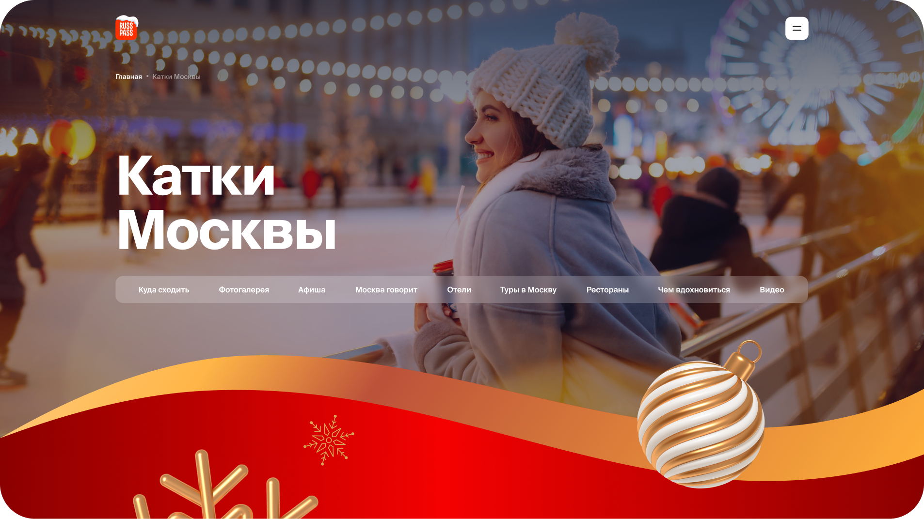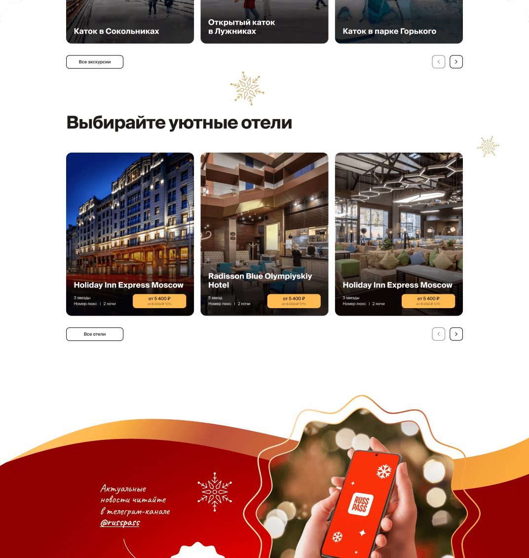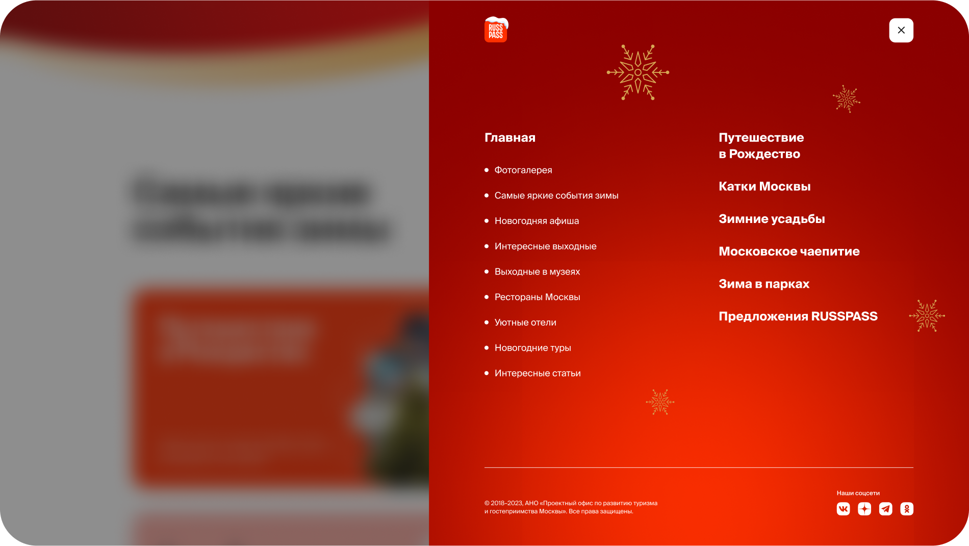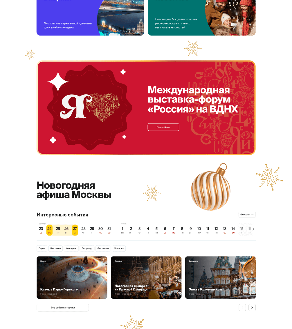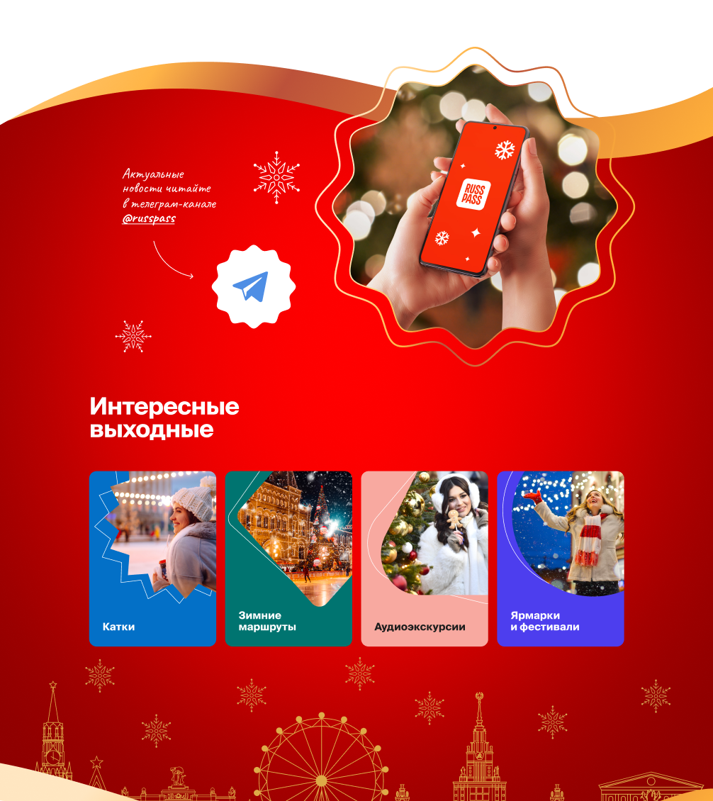 Целью разработки новогоднего сайта RUSSPASS было создание площадки, которая помогала бы москвичам и гостям столицы удобно и эффективно спланировать свое времяпрепровождение на праздничные каникулы.