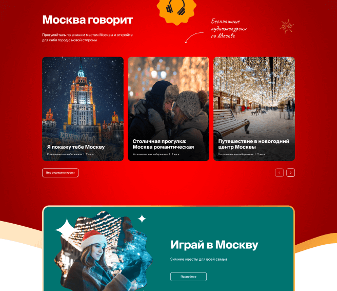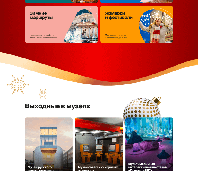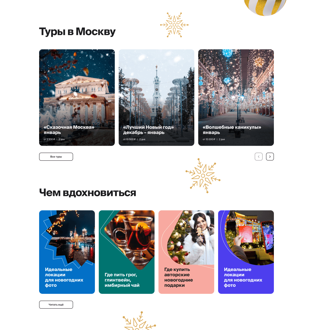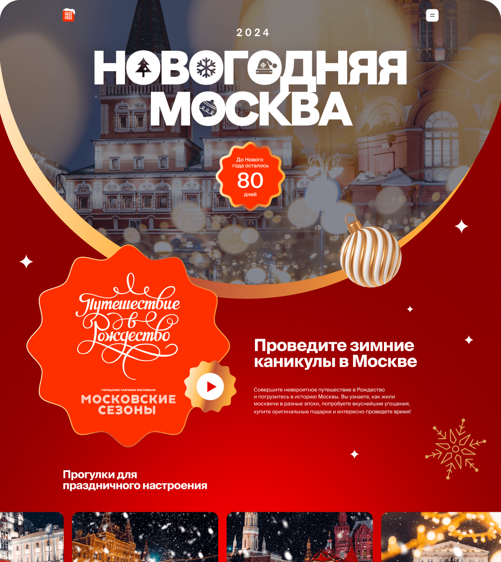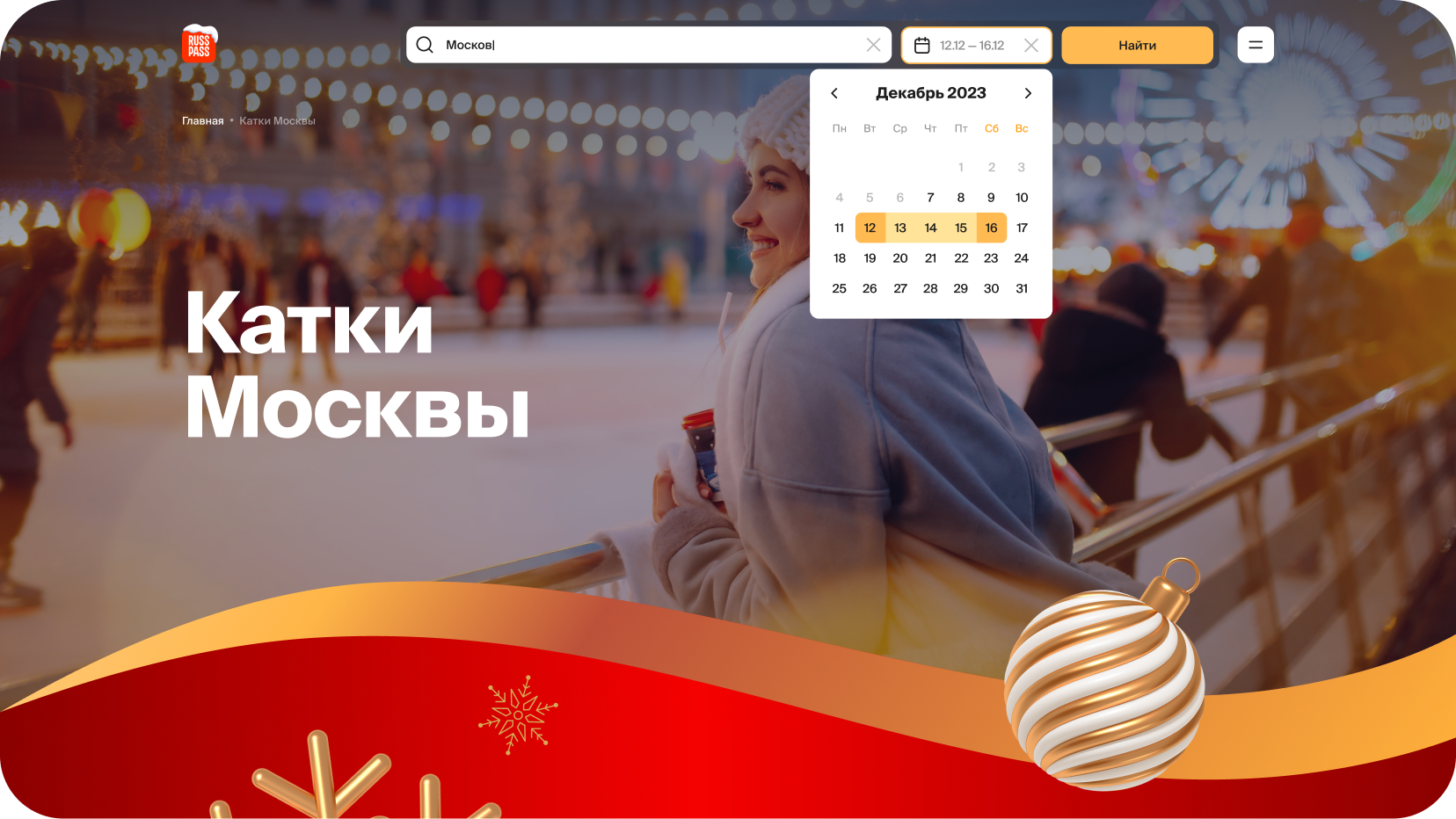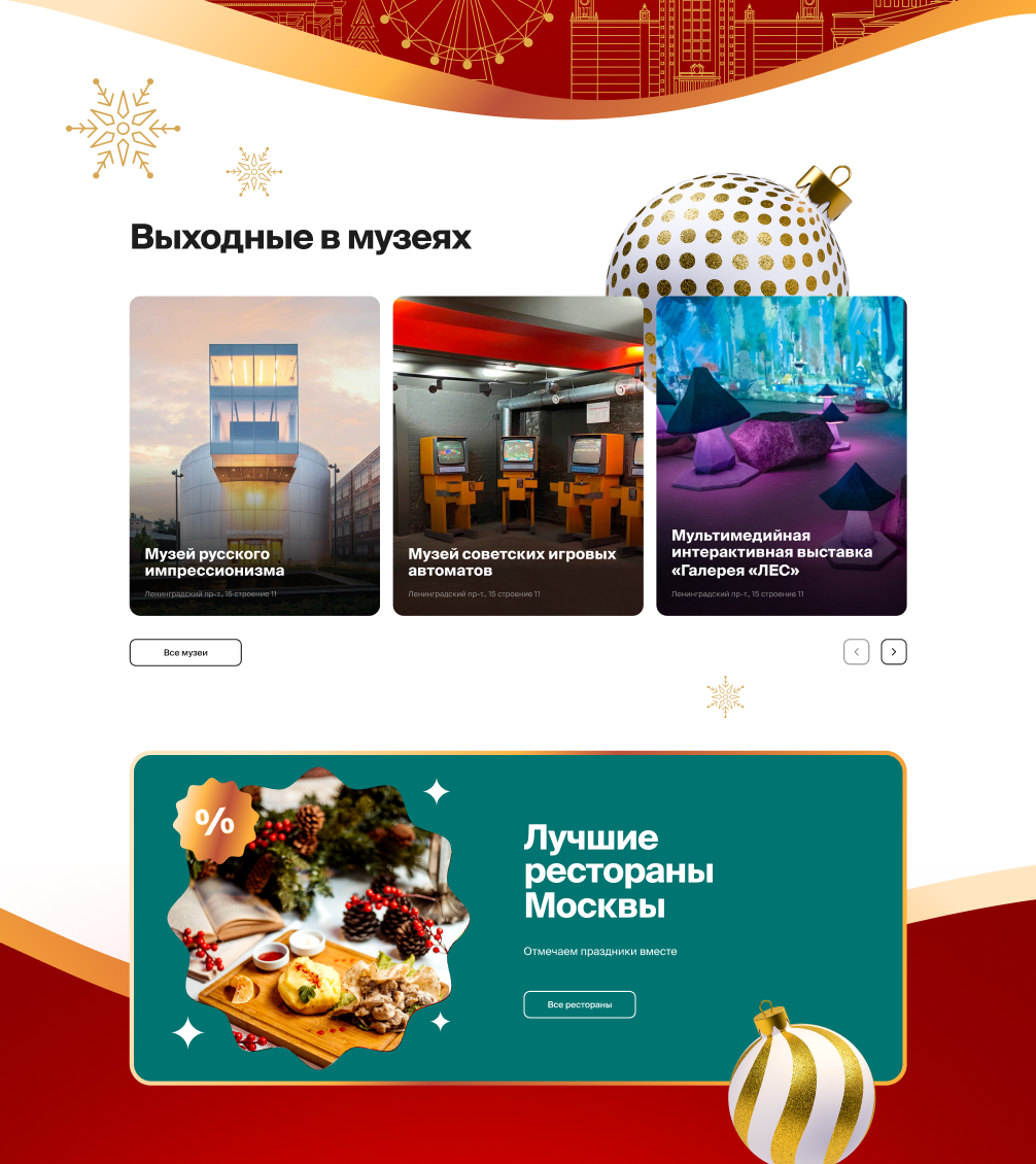 Целью разработки новогоднего сайта RUSSPASS было создание площадки, которая помогала бы москвичам и гостям столицы удобно и эффективно спланировать свое времяпрепровождение на праздничные каникулы.
