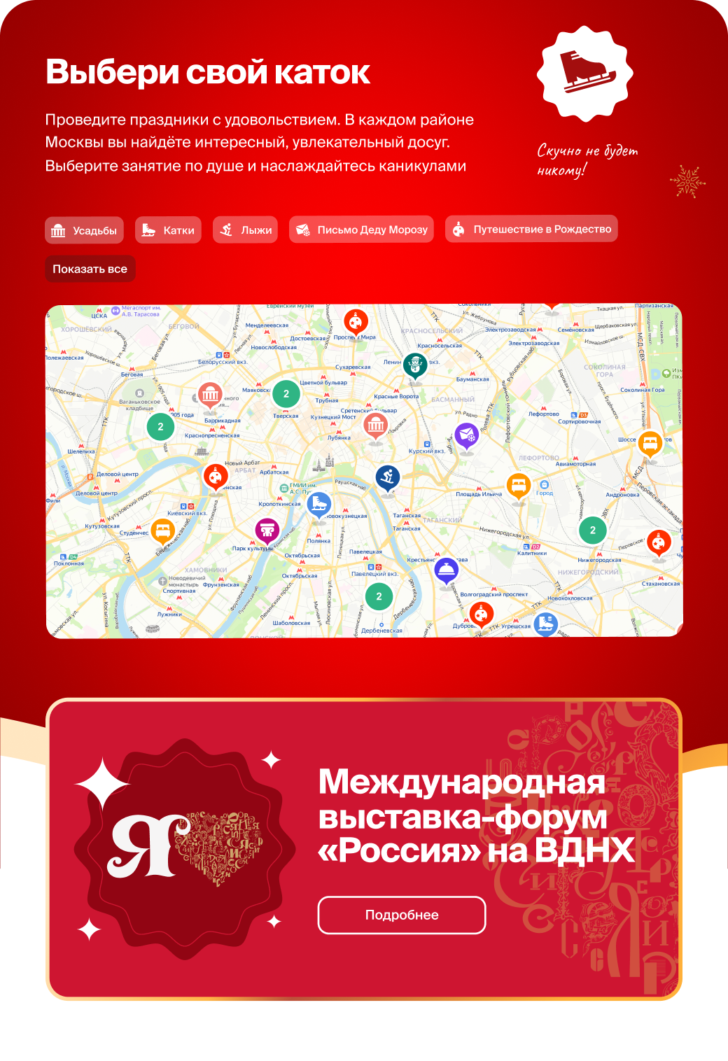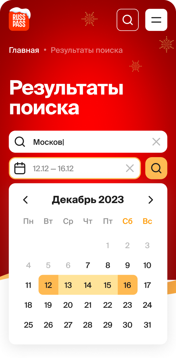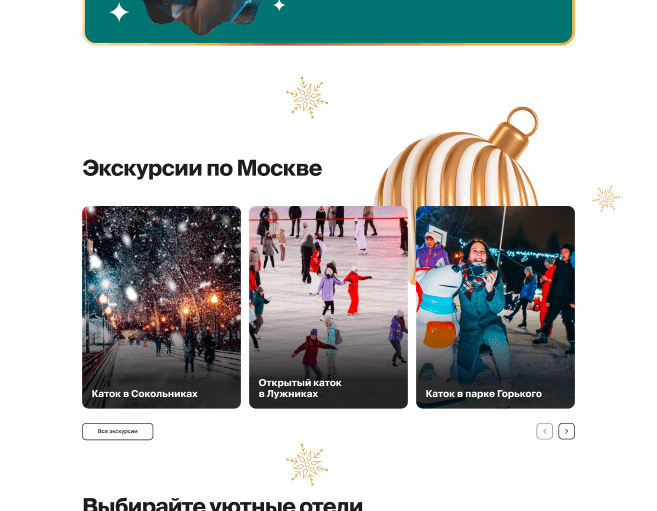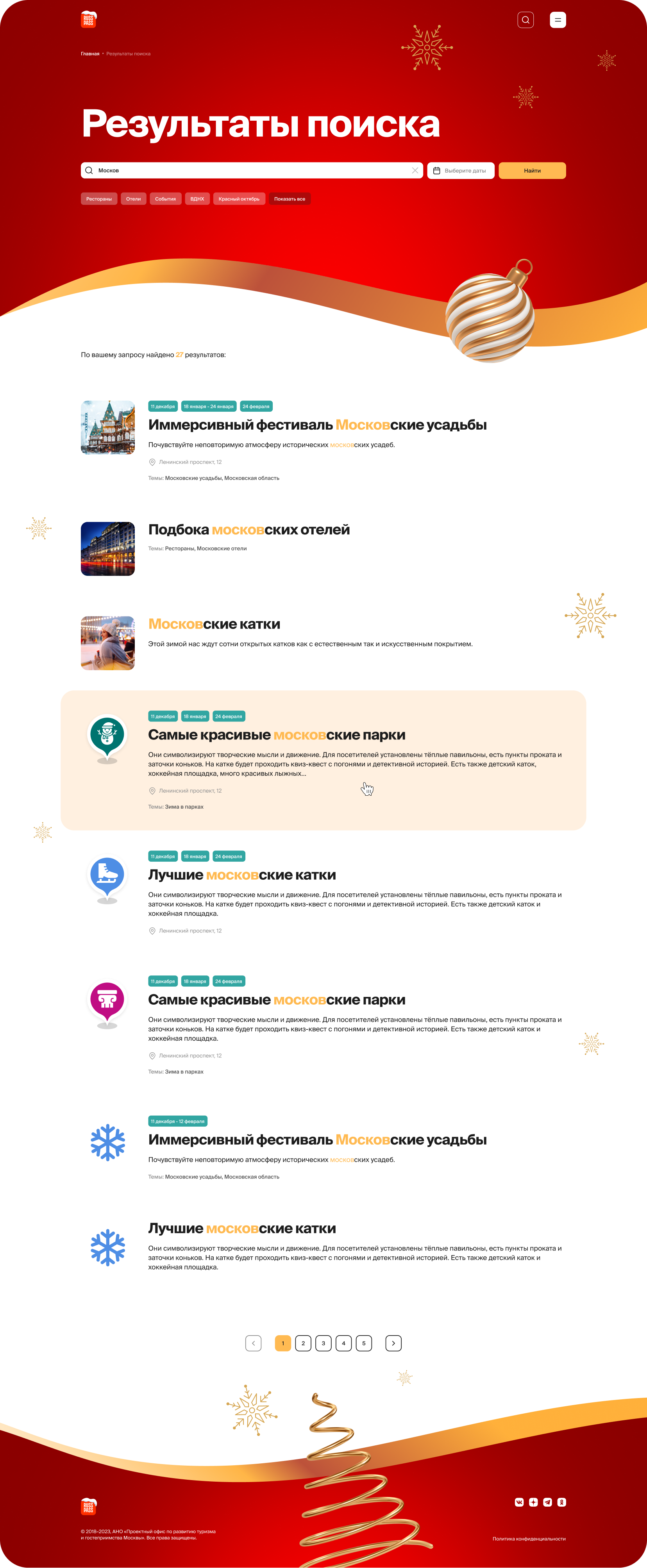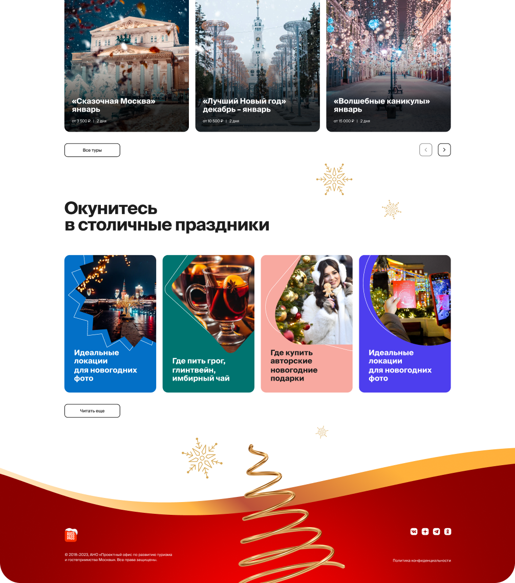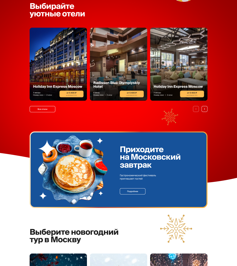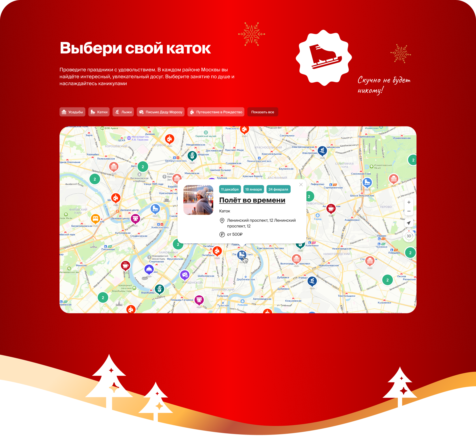 Целью разработки новогоднего сайта RUSSPASS было создание площадки, которая помогала бы москвичам и гостям столицы удобно и эффективно спланировать свое времяпрепровождение на праздничные каникулы.