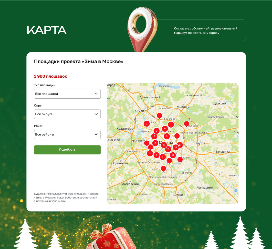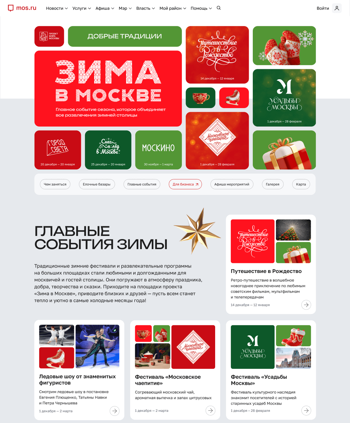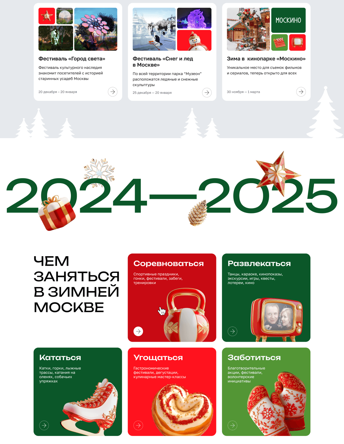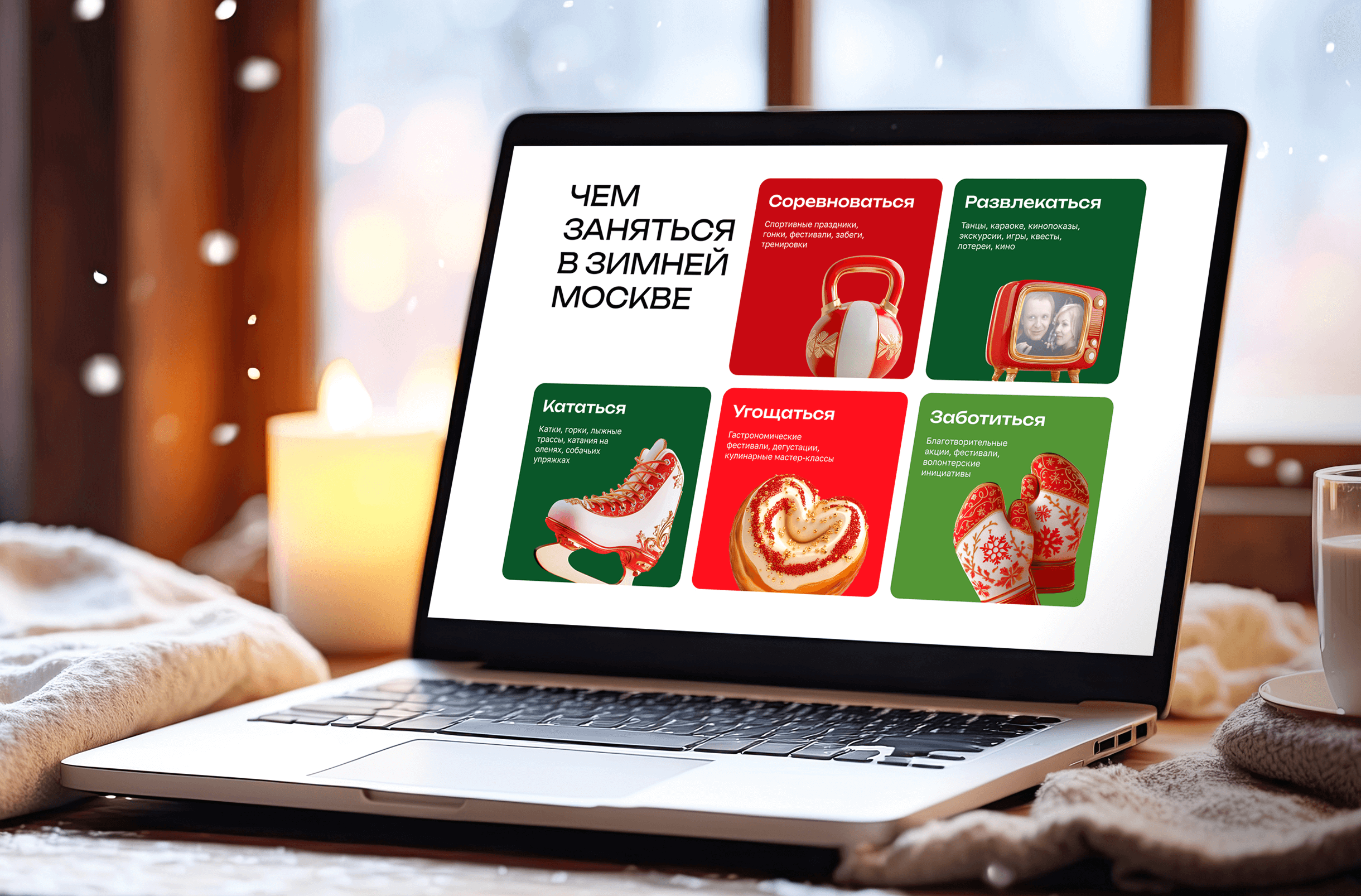 Целью разработки сайта «Зима в Москве» было создание единого информационного пространства, объединяющего всё разнообразие городских мероприятий и активностей, чтобы вдохновить жителей и гостей столицы на участие в зимних событиях.