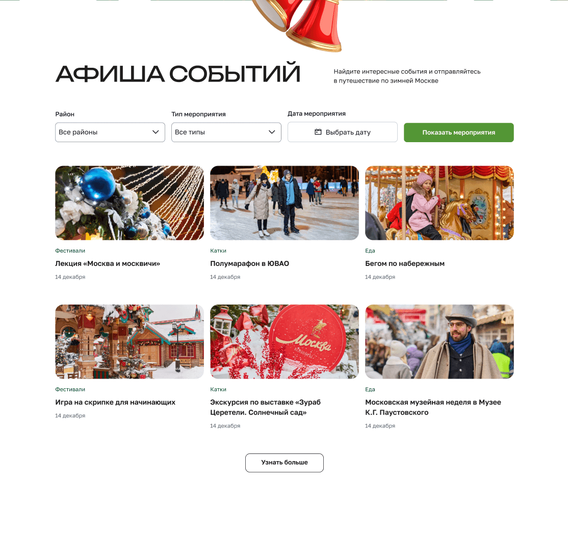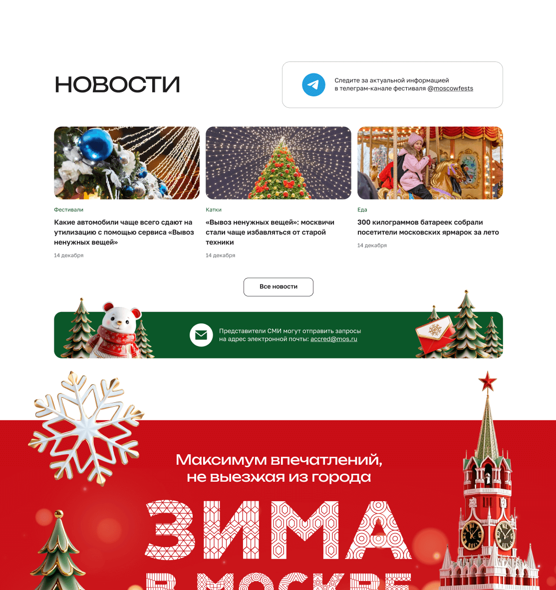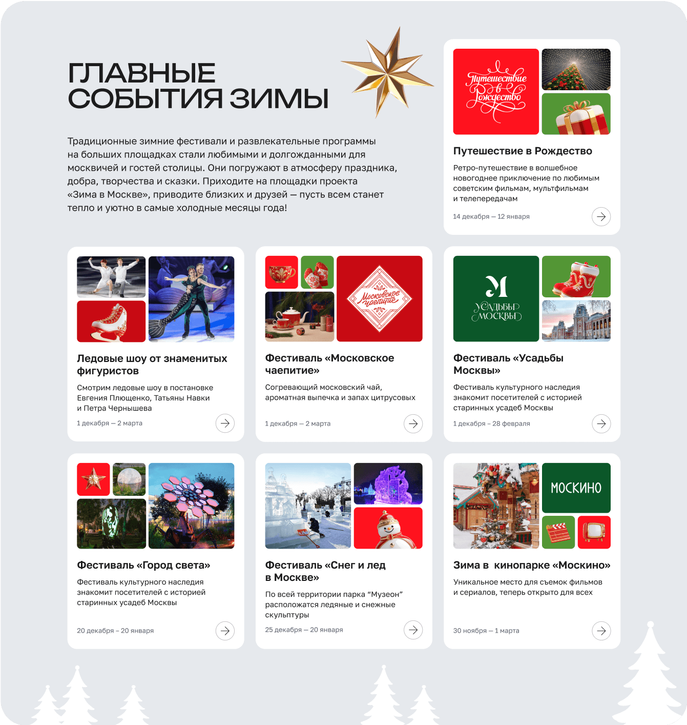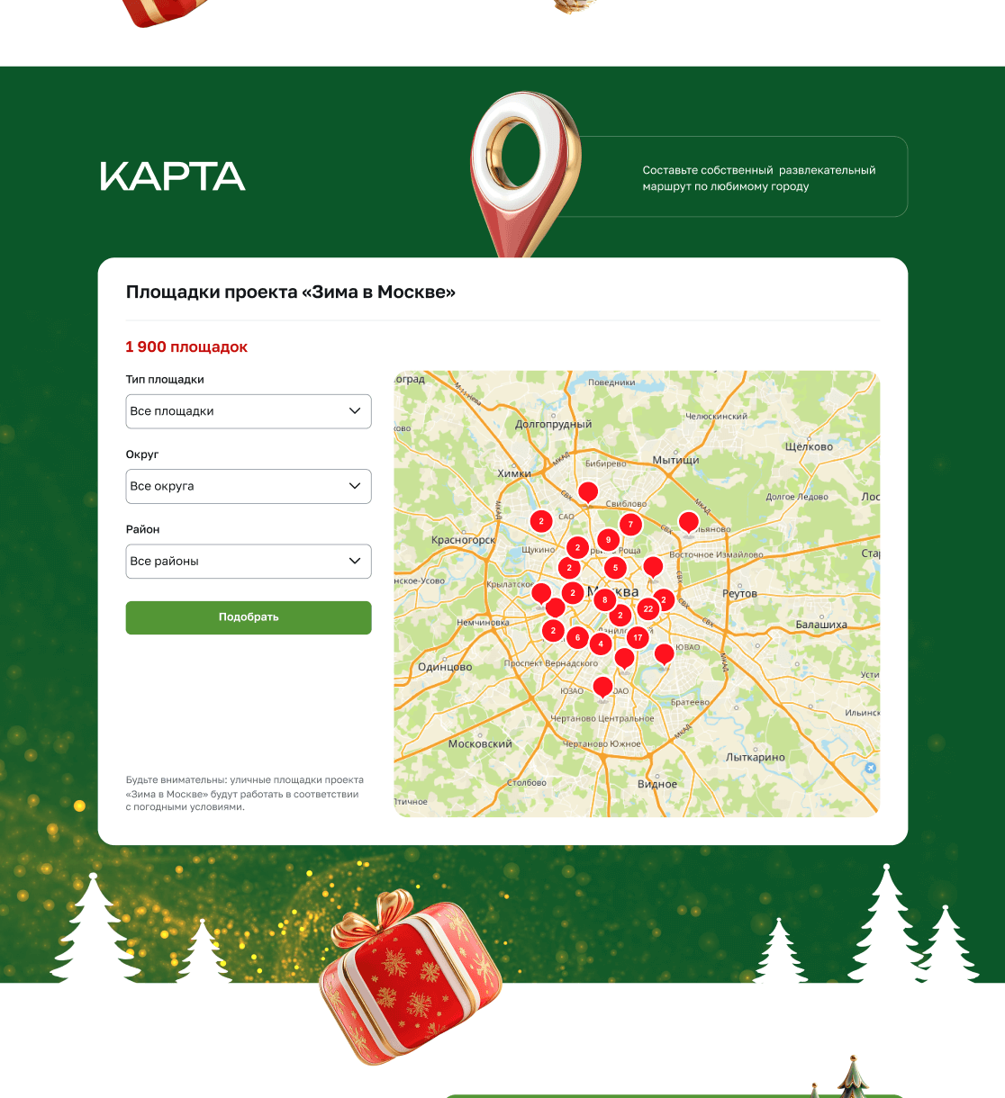 Целью разработки сайта «Зима в Москве» было создание единого информационного пространства, объединяющего всё разнообразие городских мероприятий и активностей, чтобы вдохновить жителей и гостей столицы на участие в зимних событиях.